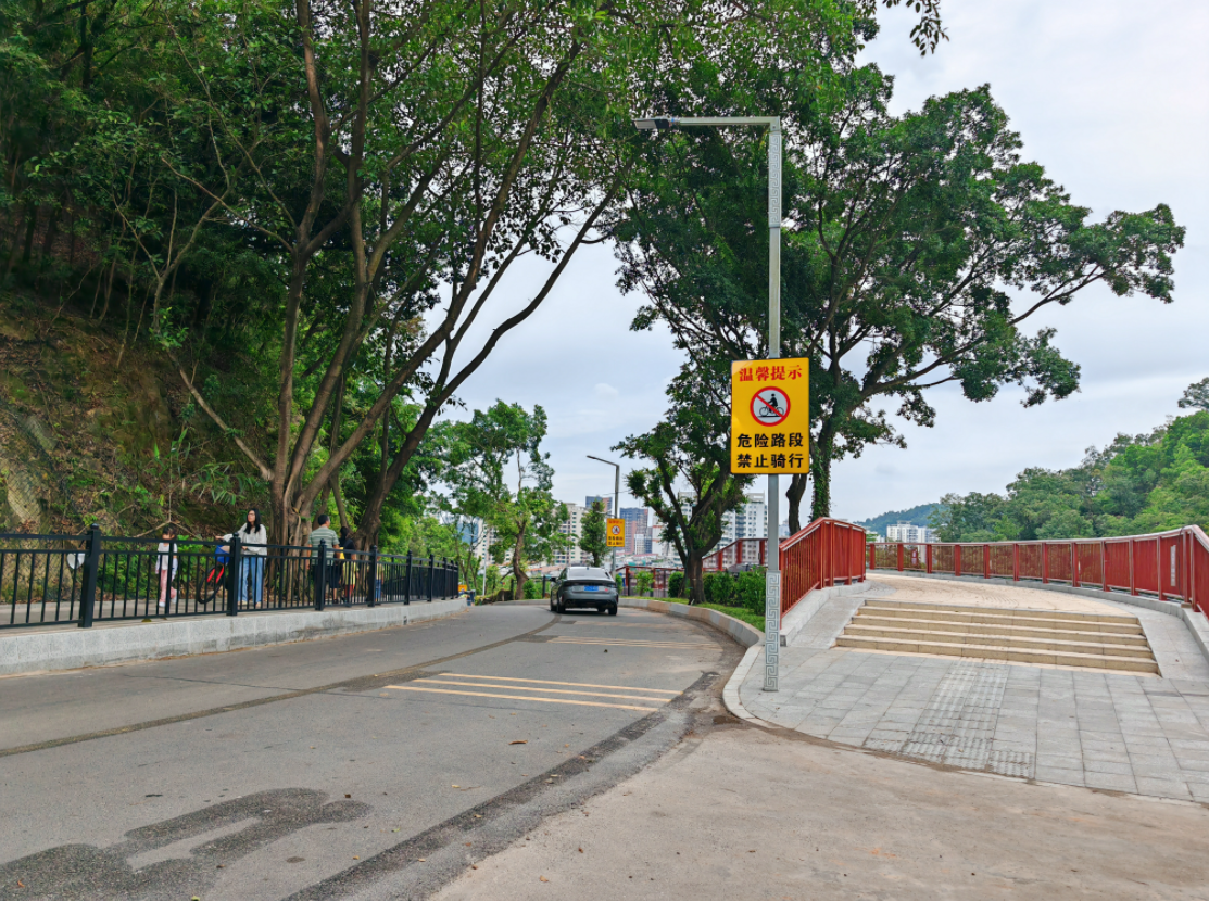 東門棧橋建成后,實現(xiàn)人車分流。棧橋兩側有“危險路段,禁止騎行”等溫馨提示牌。
