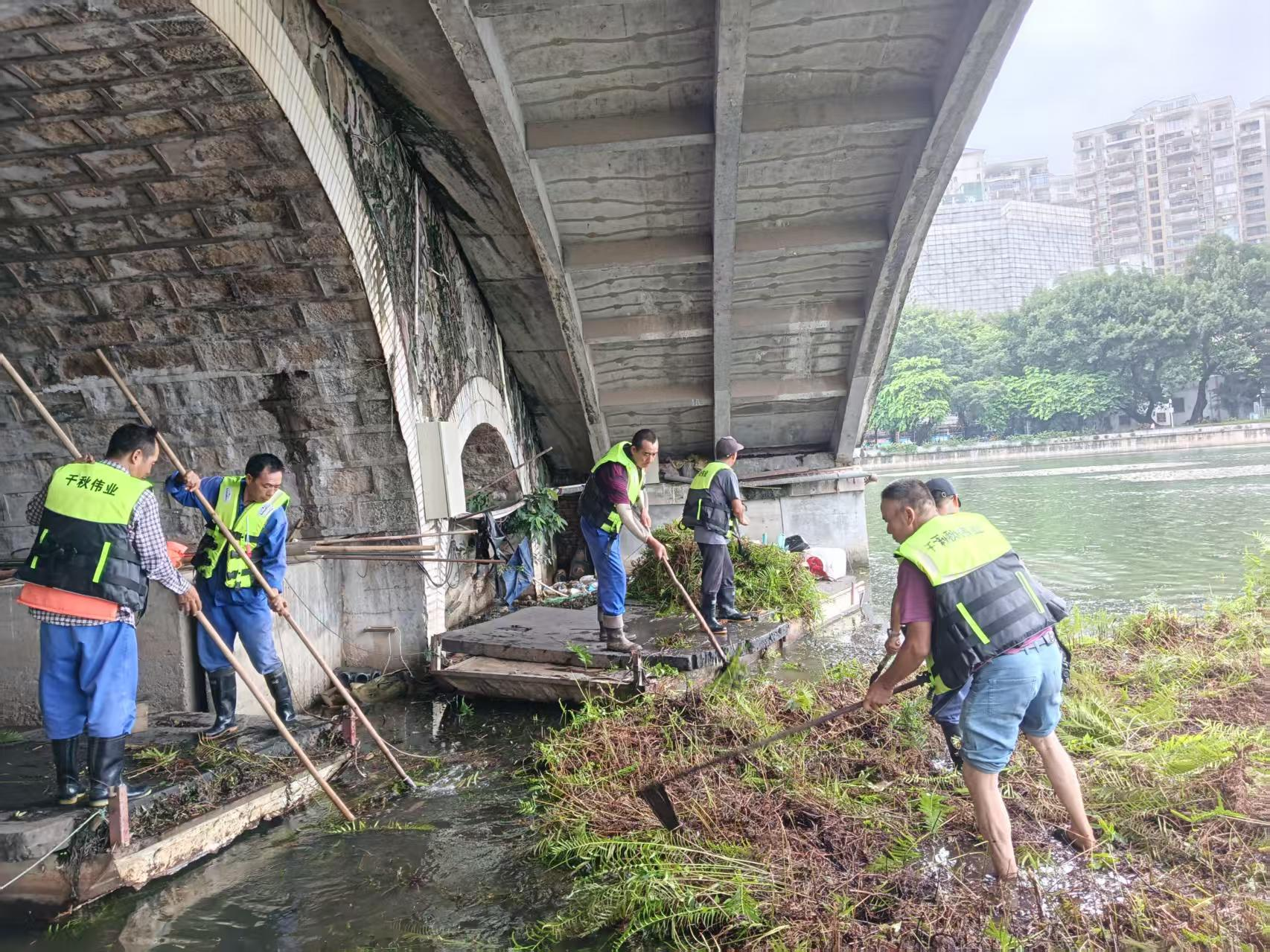 工作人員對老化的生態(tài)浮島及雜草進行清理作業(yè);葜菔形骱皡^(qū)管理中心供圖