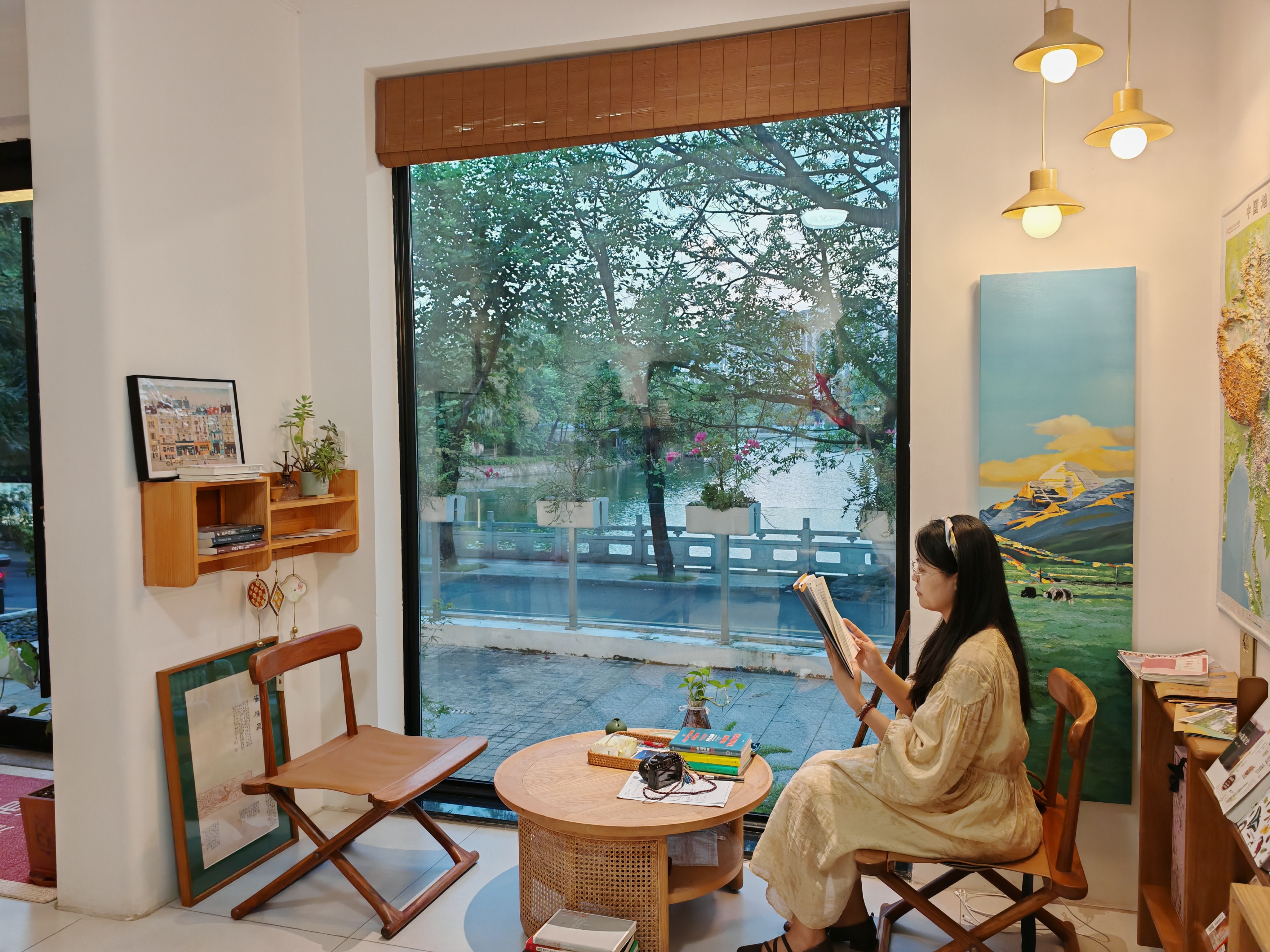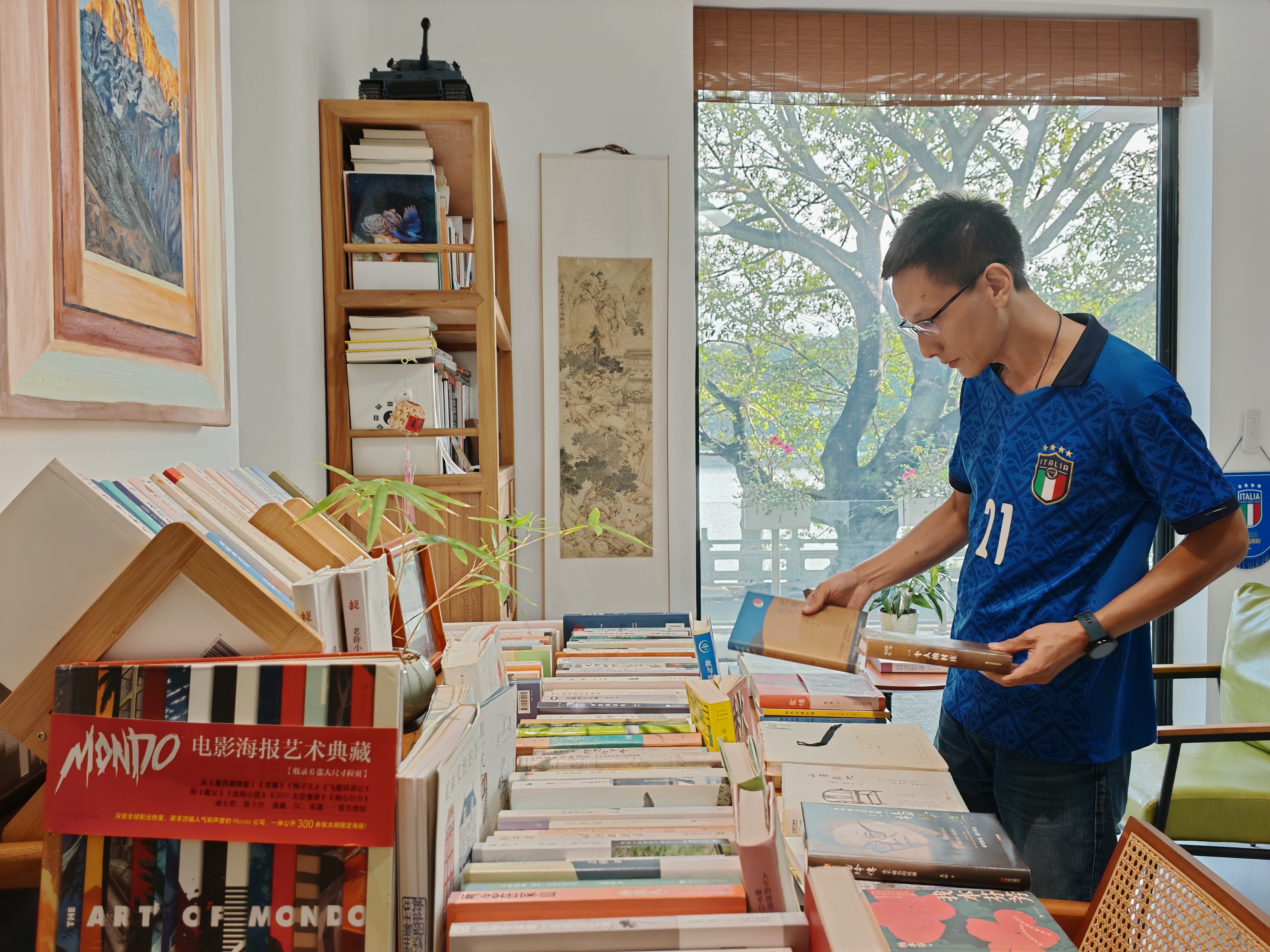 下午四時的陽光透過玻璃窗,輕柔地灑滿“圖書館”。讀者們靜靜翻閱書籍,偶爾啜一口免費提供的咖啡或茶。館內(nèi)書本、裝飾物擺放別具意趣,墻上掛畫氛圍十足,營造出一方遠離喧囂的文化凈土。