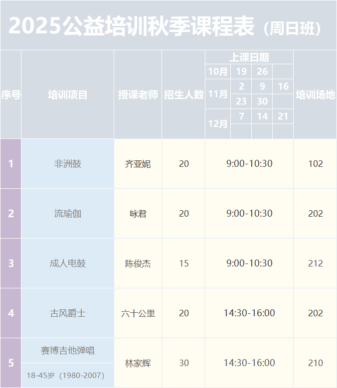 此次培訓(xùn)班課程設(shè)置多樣,既有適合青少年學(xué)習(xí)的少兒街舞、古箏等,也有面向成人的攝影、吉他彈唱等藝術(shù)課程,滿(mǎn)足不同年齡段市民的文化需求。所有課程均免費(fèi)開(kāi)放,但名額有限,采取線(xiàn)上報(bào)名、后臺(tái)隨機(jī)抽簽的方式錄取。中簽者將收到短信及“文惠圈”站內(nèi)信通知,并于9月20日至21日(10:00-16:00)前往惠州市文化館辦理入學(xué)登記。