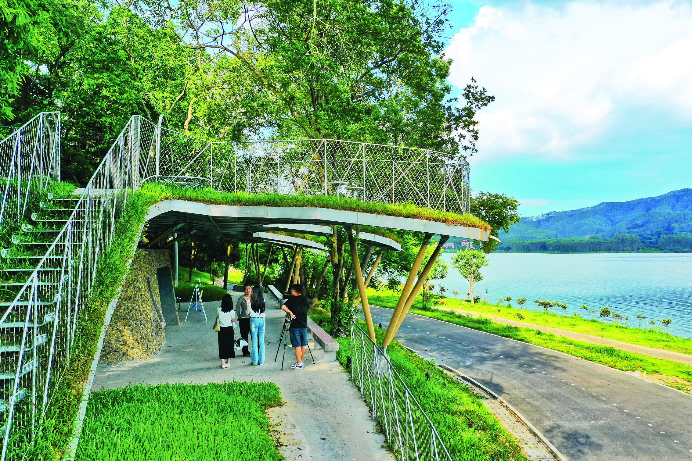 沿公路向山林深處行進,藏于山坡臺地間的“鳳谷驛”,則成為騎行者與游客的“自然休憩站”。記者走訪時看到,驛站以傳統(tǒng)道旁茶棚為意象,搭建起覆土可上人的鋼棚,延伸的挑臺如同“五指”從林間伸出,精準指向開闊的水庫風景;棚頂覆綠與上層臺地無縫銜接,讓建筑仿佛從自然中生長而出。