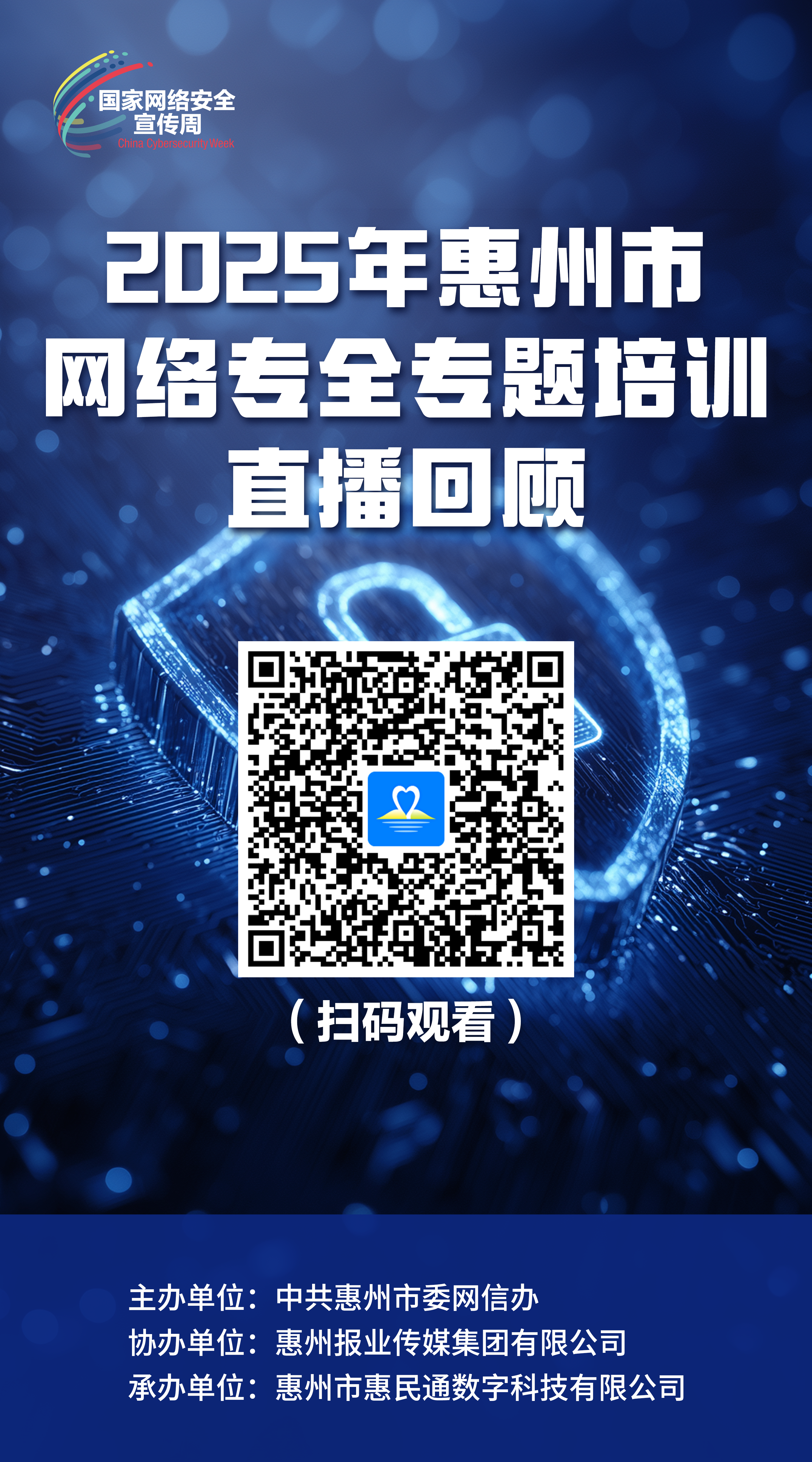 惠州日?qǐng)?bào)訊 (記者龔妍 通訊員李定方)9月19日,惠州市網(wǎng)絡(luò)安全專題培訓(xùn)舉行。該培訓(xùn)作為2025年網(wǎng)絡(luò)安全宣傳周系列活動(dòng)之一,以線上直播的方式進(jìn)行,邀請(qǐng)相關(guān)專家圍繞《網(wǎng)絡(luò)安全法》《數(shù)據(jù)安全法》《個(gè)人信息保護(hù)法》《關(guān)鍵信息基礎(chǔ)設(shè)施安全保護(hù)條例》等法律法規(guī)進(jìn)行解讀輔導(dǎo),吸引全市黨政機(jī)關(guān)、企事業(yè)單位代表及廣大市民參與。