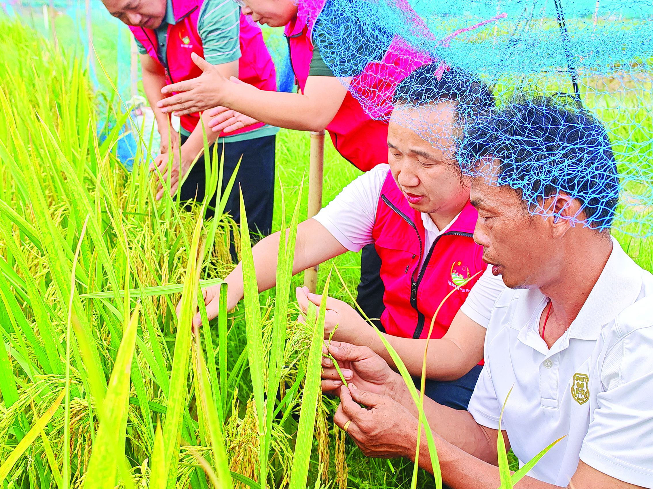王暢新(右一)在農(nóng)技部門支持下,擴(kuò)大旱稻種植面積,示范種植水稻新品種。 惠州日報(bào)記者陳春惠 攝