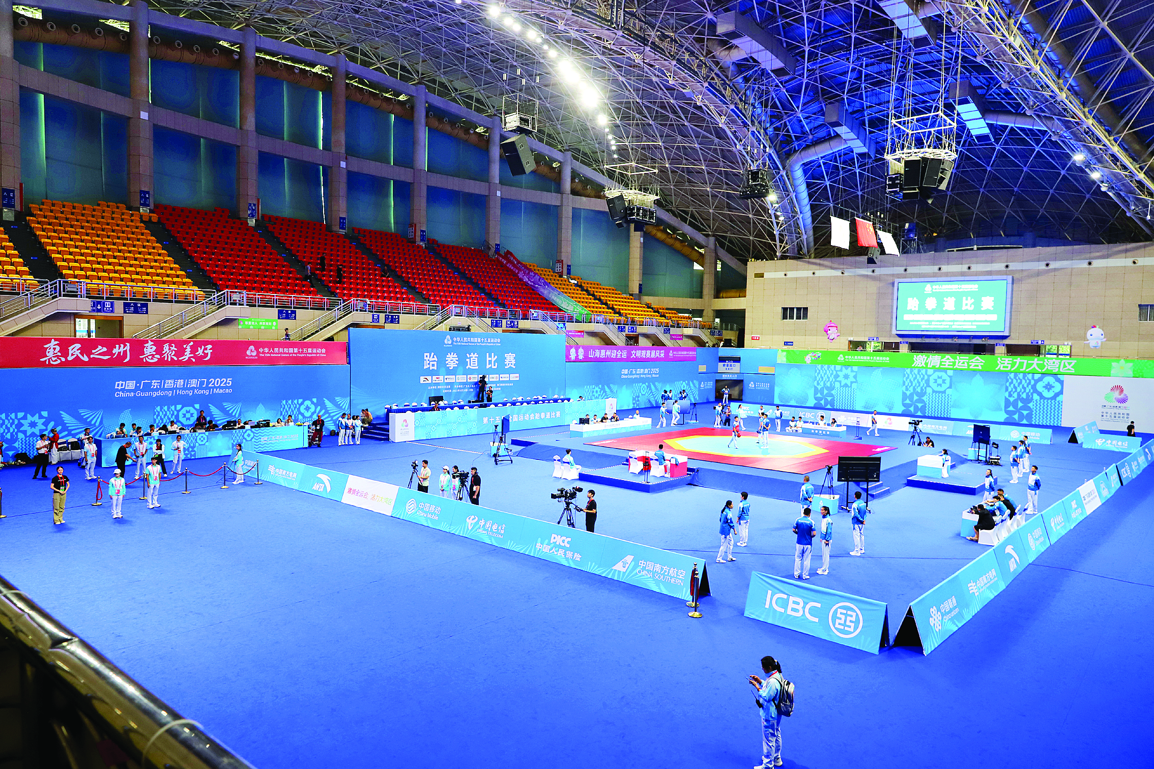 9月25日,惠州體育館十五運會跆拳道比賽聯(lián)排現(xiàn)場,各項工作已準備就緒。