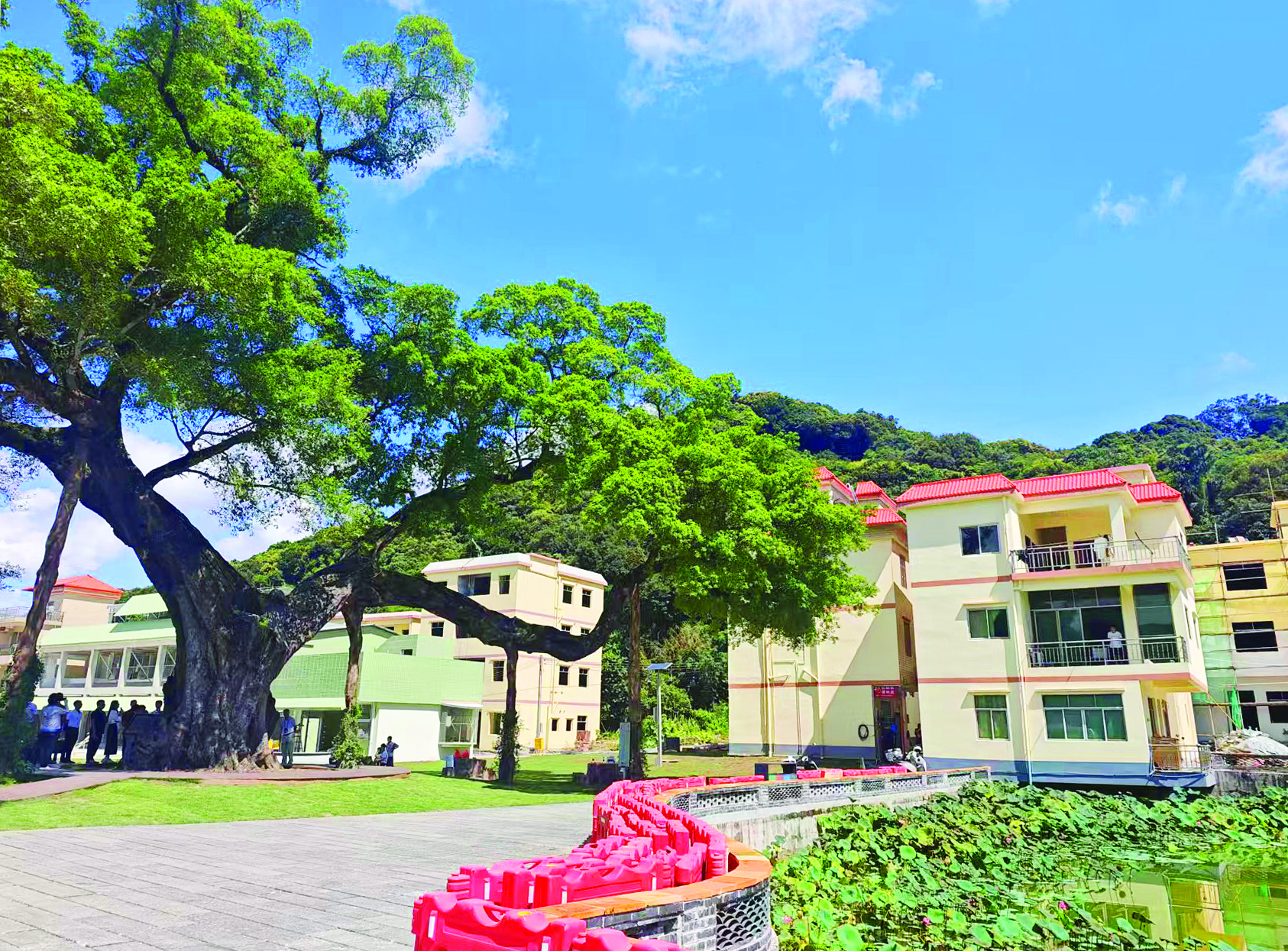 在龍門縣麻榨鎮(zhèn)中心村,黃墻橙瓦的驛站與千年榕樹相映成趣。惠州日?qǐng)?bào)記者游璇鈺 攝