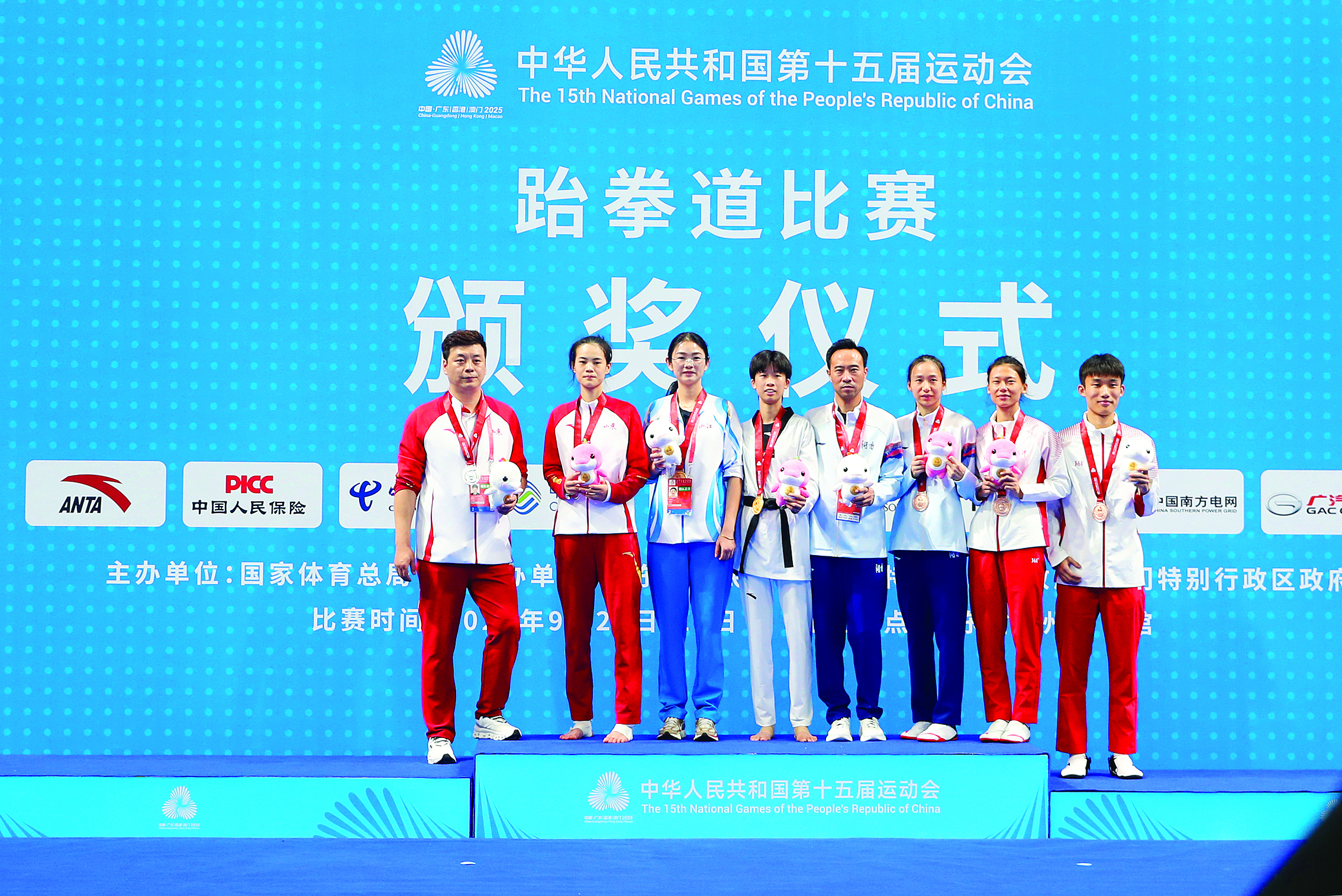 廣東隊(duì)選手黃科奮(右)獲十五運(yùn)會(huì)跆拳道男子58公斤級(jí)冠軍。頒獎(jiǎng)儀式上他和教練員上臺(tái)領(lǐng)獎(jiǎng)。 惠州日?qǐng)?bào)記者鐘暢新 攝