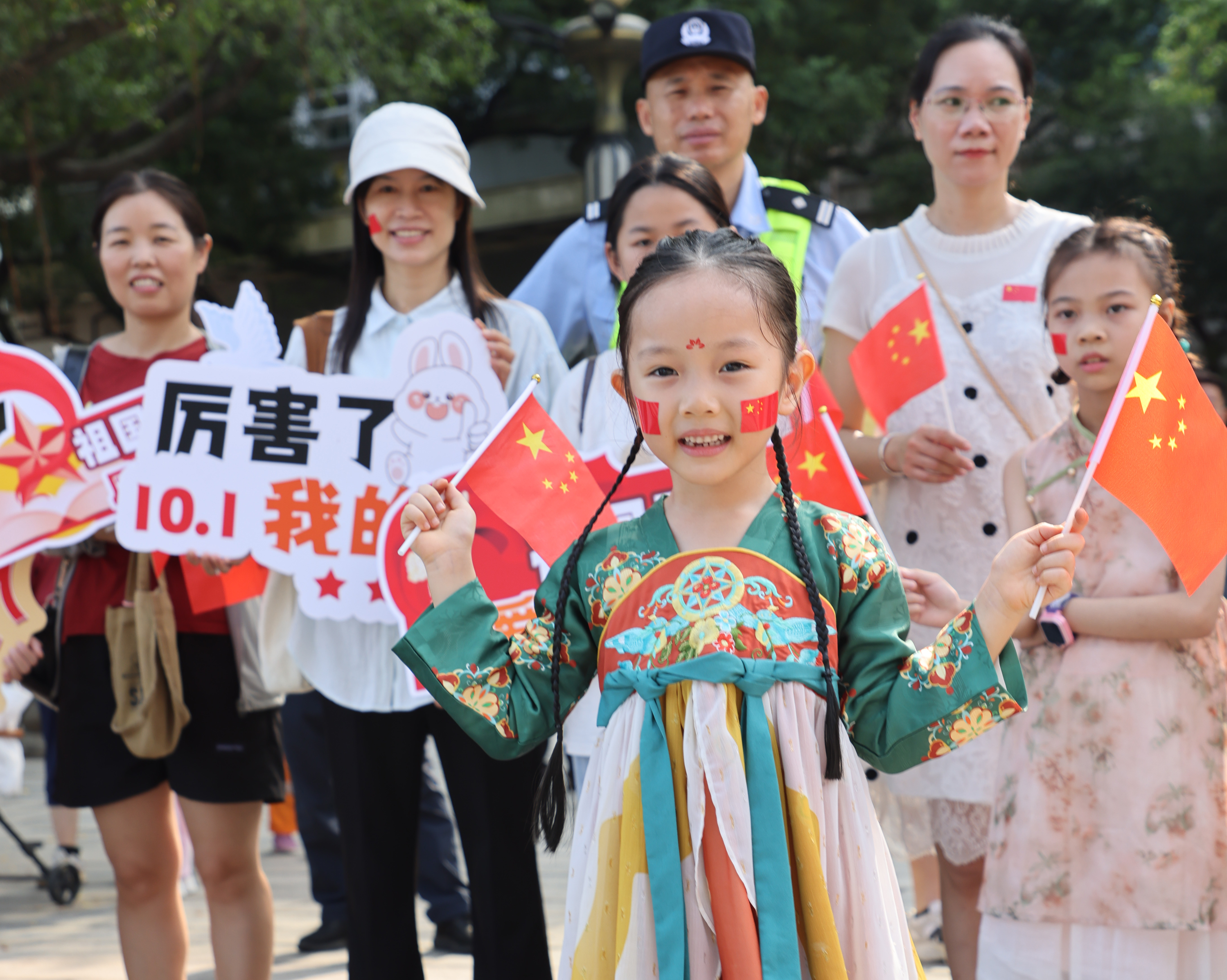 10月1日上午,惠州西湖風(fēng)景名勝區(qū)紅旗飄飄,與山水風(fēng)光交輝相映,國慶佳節(jié)到來之際,市民游客揮舞著手中的國旗,絡(luò)繹不絕前來觀光游玩。平湖門入口前,《我和我的祖國》歌曲響起,在愉悅的吉他聲中,大家伴著熟悉的旋律,高聲歌唱起來,音樂與愛國情懷激情碰撞,共同祝福祖國繁榮昌盛。