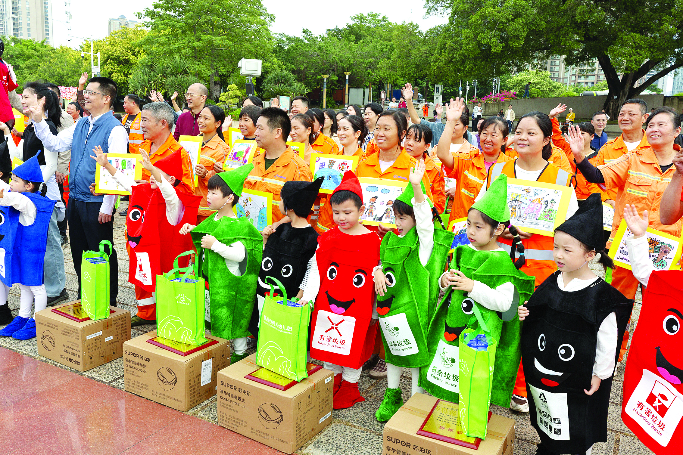 上午10時(shí)55分,活動(dòng)迎來(lái)動(dòng)人一幕;葜菔袡C(jī)關(guān)幼兒園的孩子們身著垃圾分類主題表演服,蹦蹦跳跳地登臺(tái),獻(xiàn)上舞蹈《垃圾分好類,地球不喊累》。他們用稚嫩的動(dòng)作比劃分類手勢(shì),模仿?lián)焓袄,童趣十足的表演傳遞著垃圾分類理念。