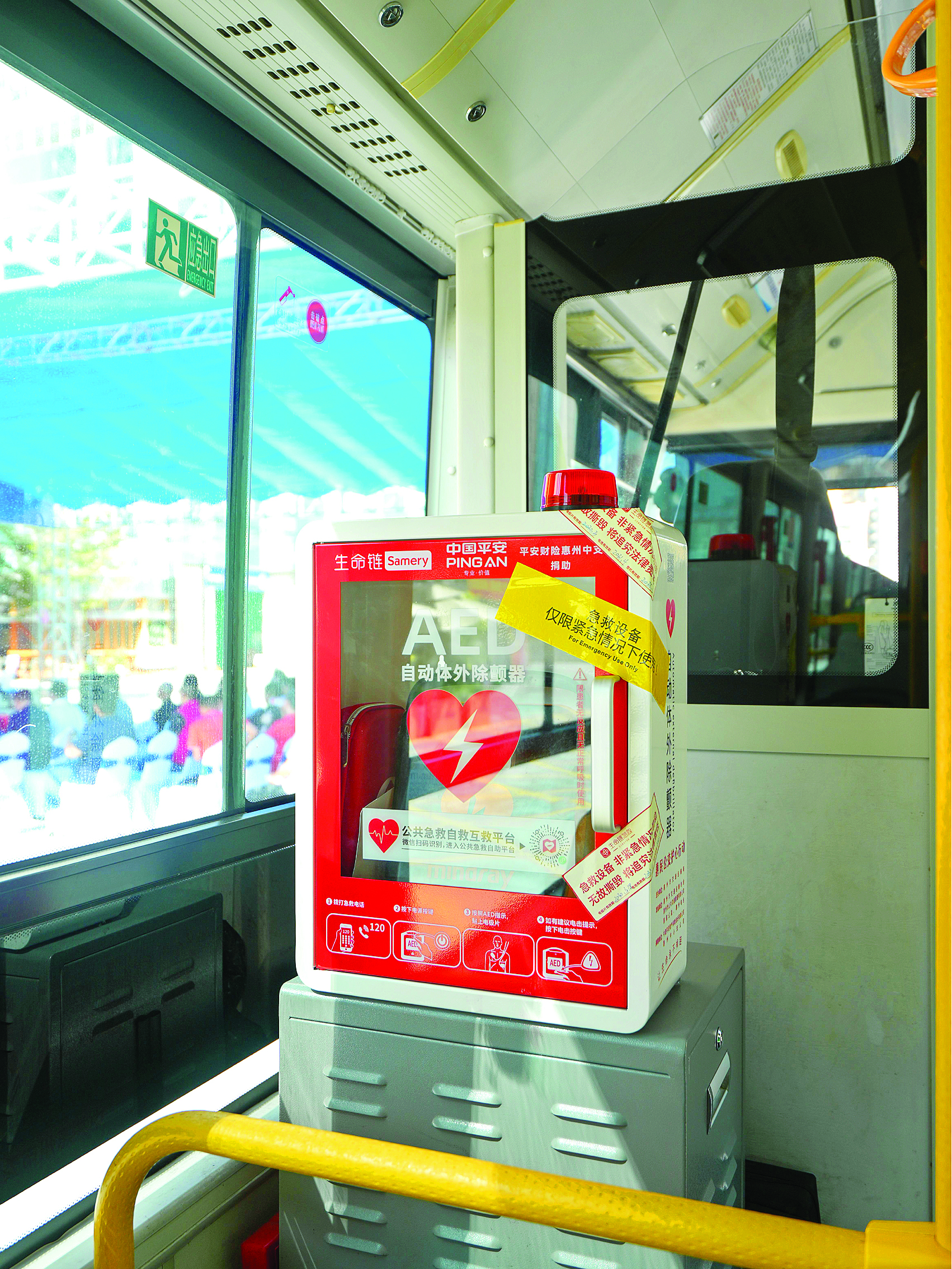 日前,2025年惠州市公交出行宣傳周暨“惠民公交護(hù)心行動(dòng)”公益活動(dòng)舉行;顒(dòng)中,由平安財(cái)險(xiǎn)惠州中心支公司捐贈(zèng)的首批5臺(tái)自動(dòng)體外除顫器(AED)投放在1路、15路、19路、21路、37路等5條適老化公交線路上。