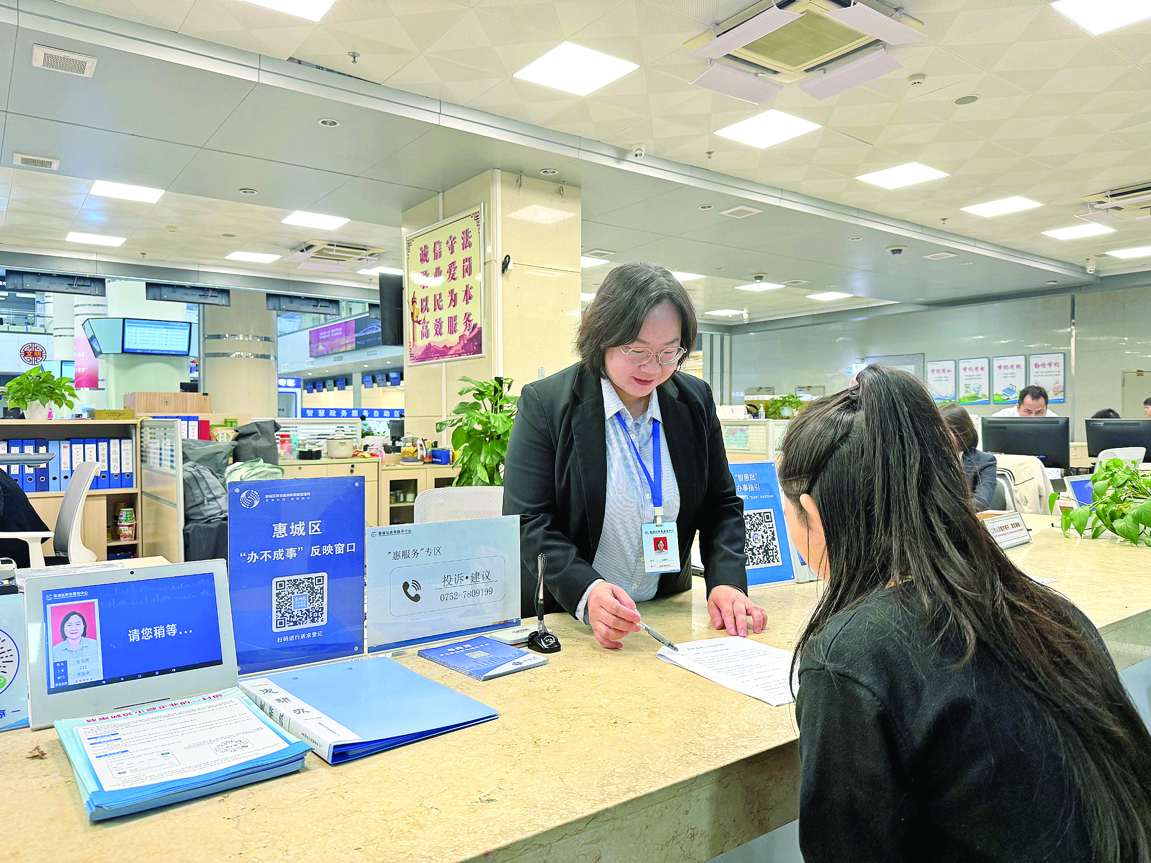 走進(jìn)惠城區(qū)政務(wù)服務(wù)中心,“辦不成事”反映窗口標(biāo)牌的藍(lán)色工位尤其醒目。