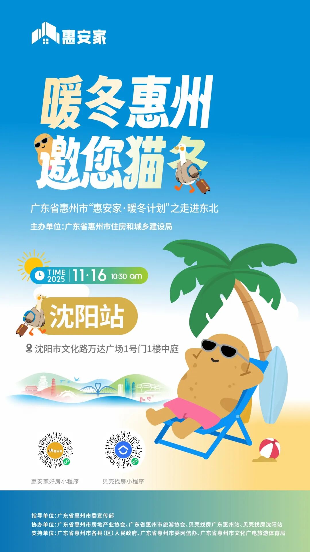 11月16日沈陽站,我們將帶來惠州文旅、安居的一手資訊,現(xiàn)場解鎖專屬購房優(yōu)惠!掃描海報下方 “惠安家好房小程序”“貝殼找房小程序”,提前了解優(yōu)質(zhì)房源與政策詳情,把山海美景、暖冬陽光與安穩(wěn)生活一起 “打包” 帶回家。