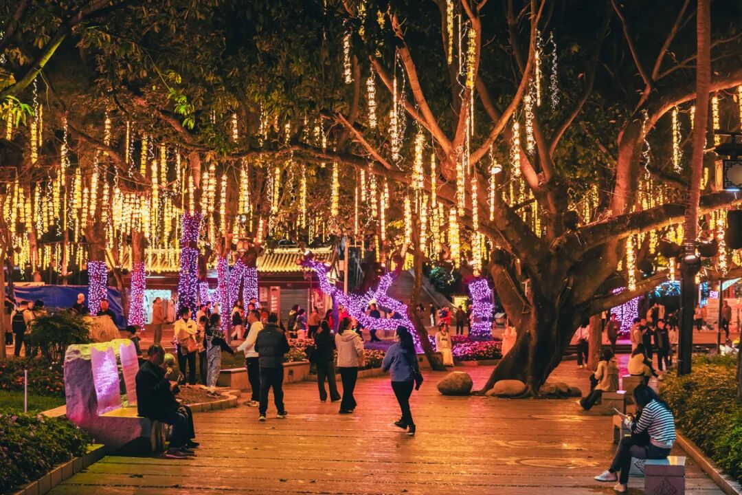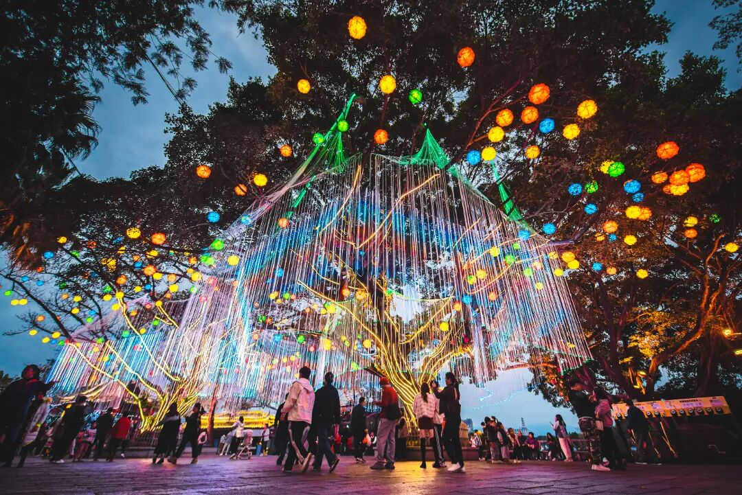 兩旁參天大榕樹(shù)在燈光的映照下七彩變幻