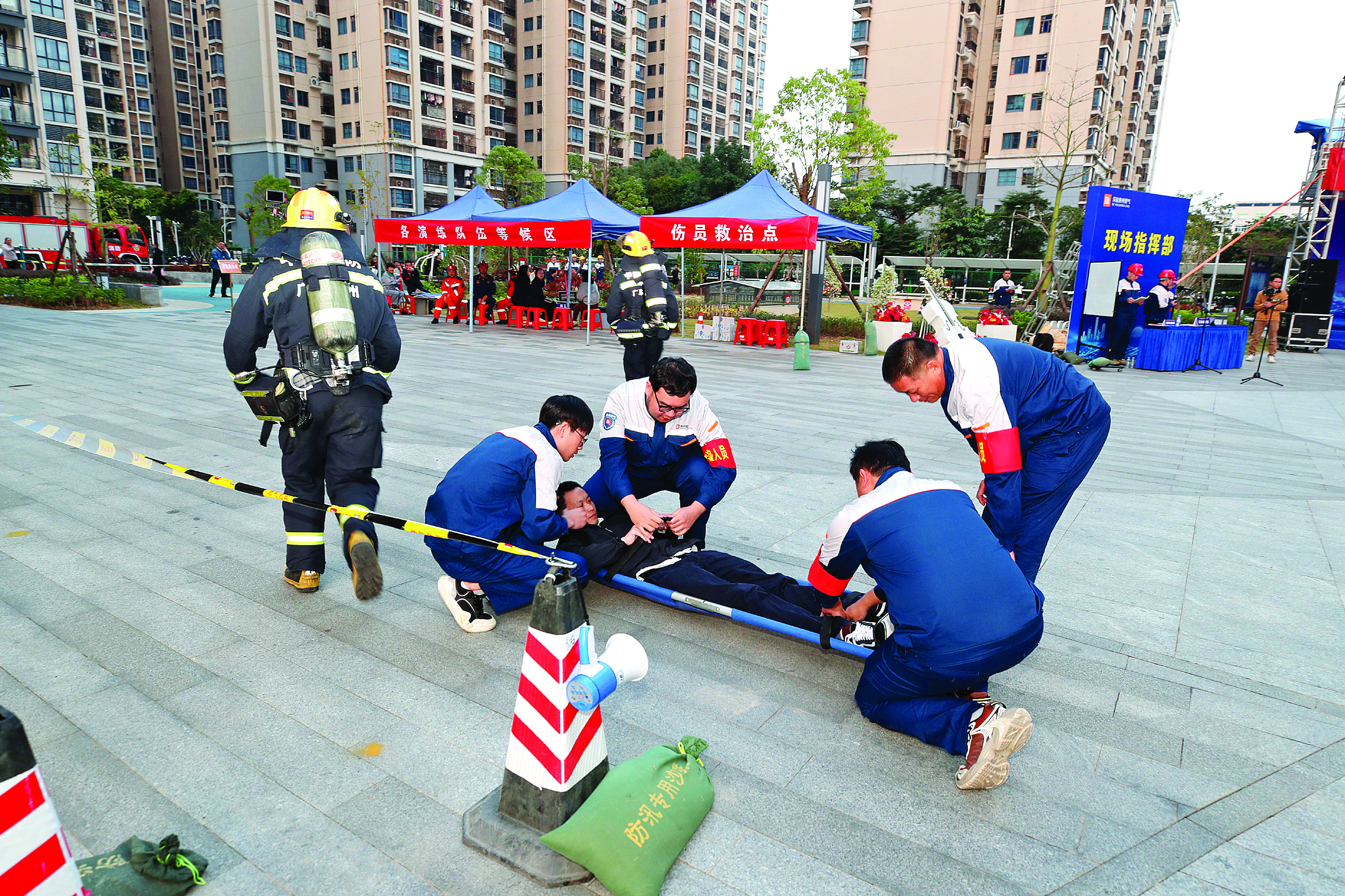 演練中,將“傷員”移出警戒區(qū)進行救護。惠州日報記者鐘暢新 攝