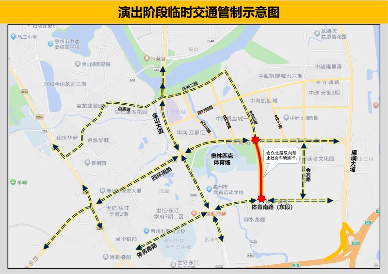 惠州公安交管部門提醒,請(qǐng)前往惠州奧林匹克體育場(chǎng)的觀眾盡量選擇大巴車接駁出行,到就近的接駁點(diǎn)換乘大巴往返。請(qǐng)途經(jīng)車輛提前規(guī)劃好行車線路,避開(kāi)上述交通管制路段出行,以免交通擁堵。