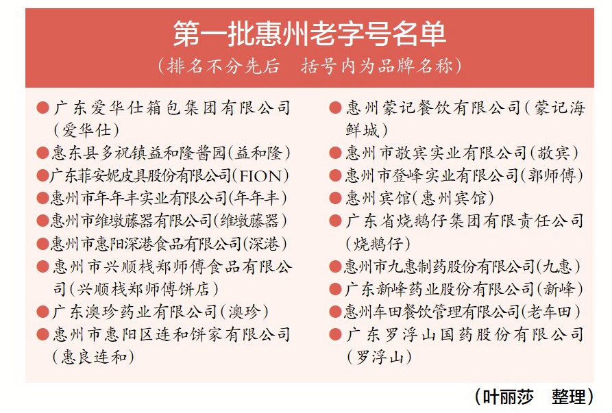 根據(jù)今年7月印發(fā)的《惠州老字號(hào)認(rèn)定管理辦法》,認(rèn)定工作由市商務(wù)局、市文化廣電旅游體育局、市市場監(jiān)管局組織開展,認(rèn)定周期為每2年一次。本次認(rèn)定經(jīng)企業(yè)自主申報(bào)、縣(區(qū))商務(wù)主管部門推薦、專家評(píng)審、征求有關(guān)單位意見、實(shí)地核查、社會(huì)公示等規(guī)范程序,最終確定涵蓋箱包皮具、食品加工、餐飲服務(wù)、工藝制造和醫(yī)藥健康等領(lǐng)域的18個(gè)品牌。