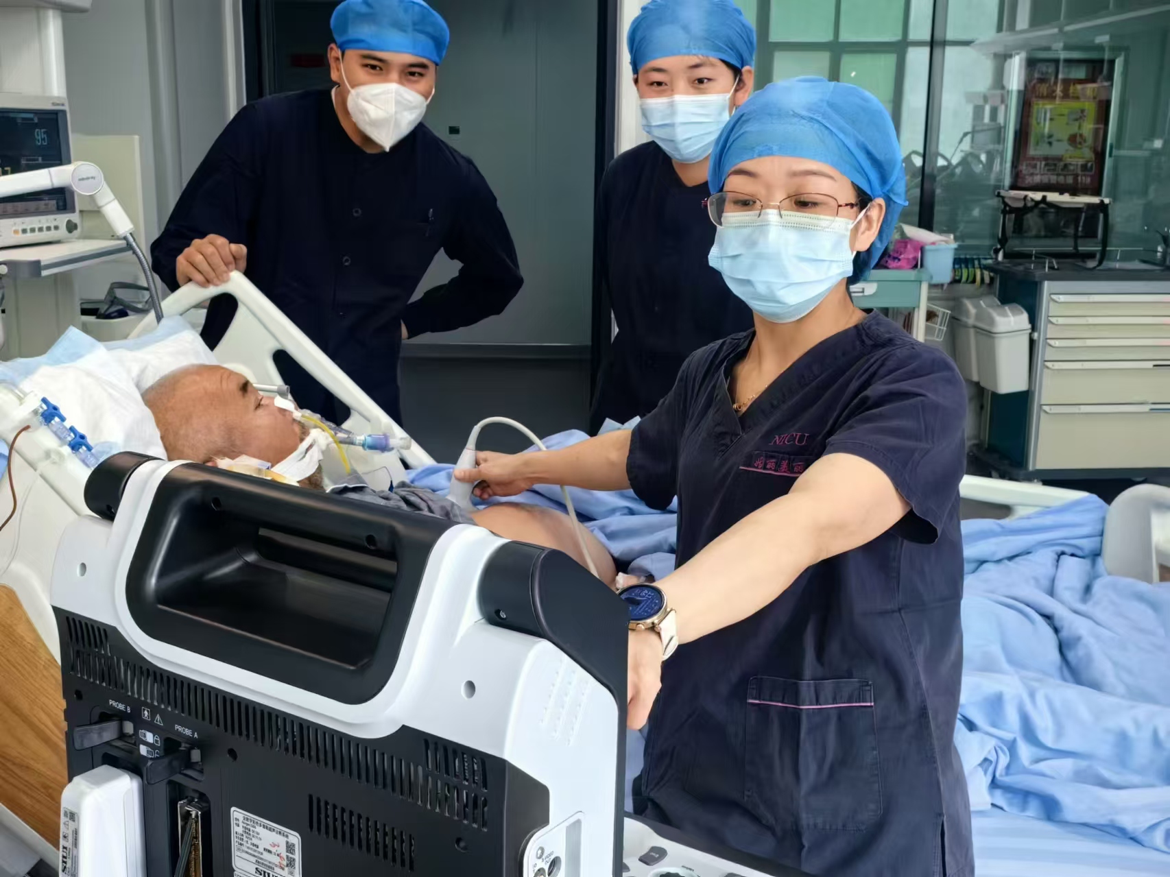 鄒錦秀(右一)在進行床旁重癥超聲示教。
