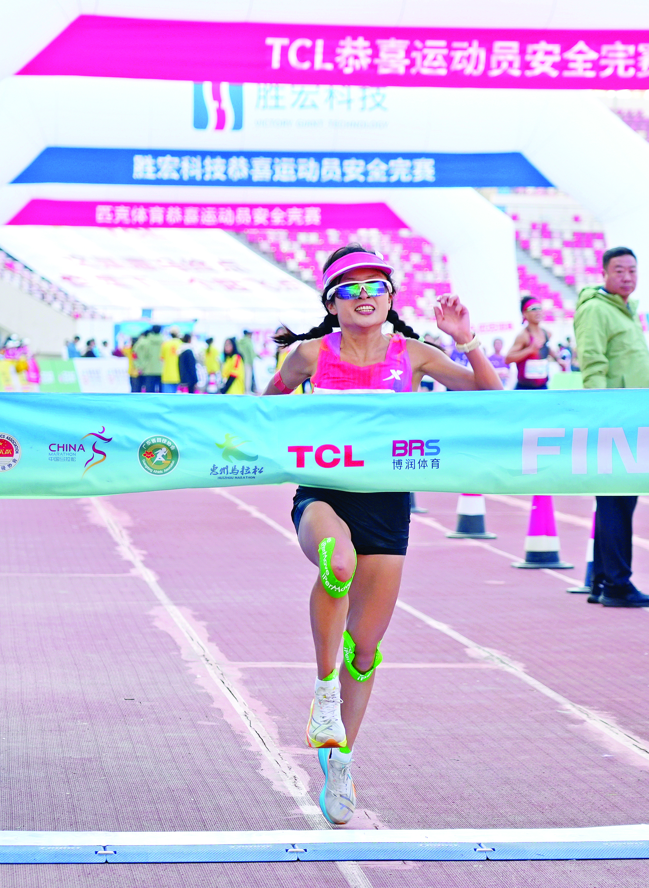 獲得全馬女子組第二名的賀金蘭連續(xù)兩年參加惠馬,去年獲得第四名,今年獲得第二名,她坦言“有點(diǎn)意外”。沖過(guò)終點(diǎn)線后,她轉(zhuǎn)身脫下遮陽(yáng)帽,面向剛剛馳騁過(guò)的賽道敬禮,以這個(gè)特殊的姿勢(shì)向賽事與城市致敬。