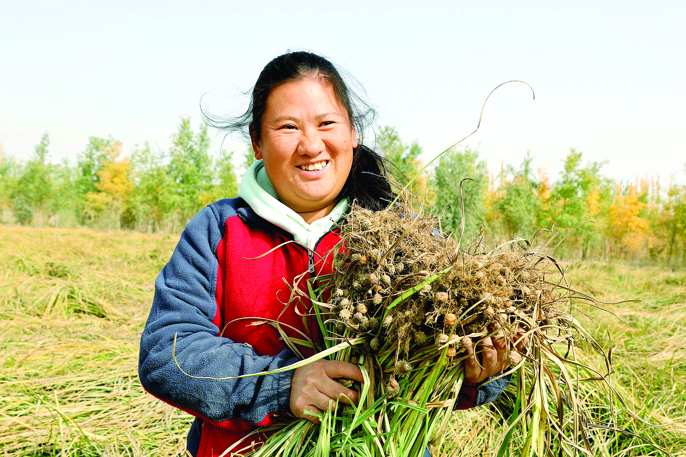 五十四團(tuán)二連職工開(kāi)心地展示豐收的油莎豆。 惠州日?qǐng)?bào)記者李松權(quán) 香金群 攝