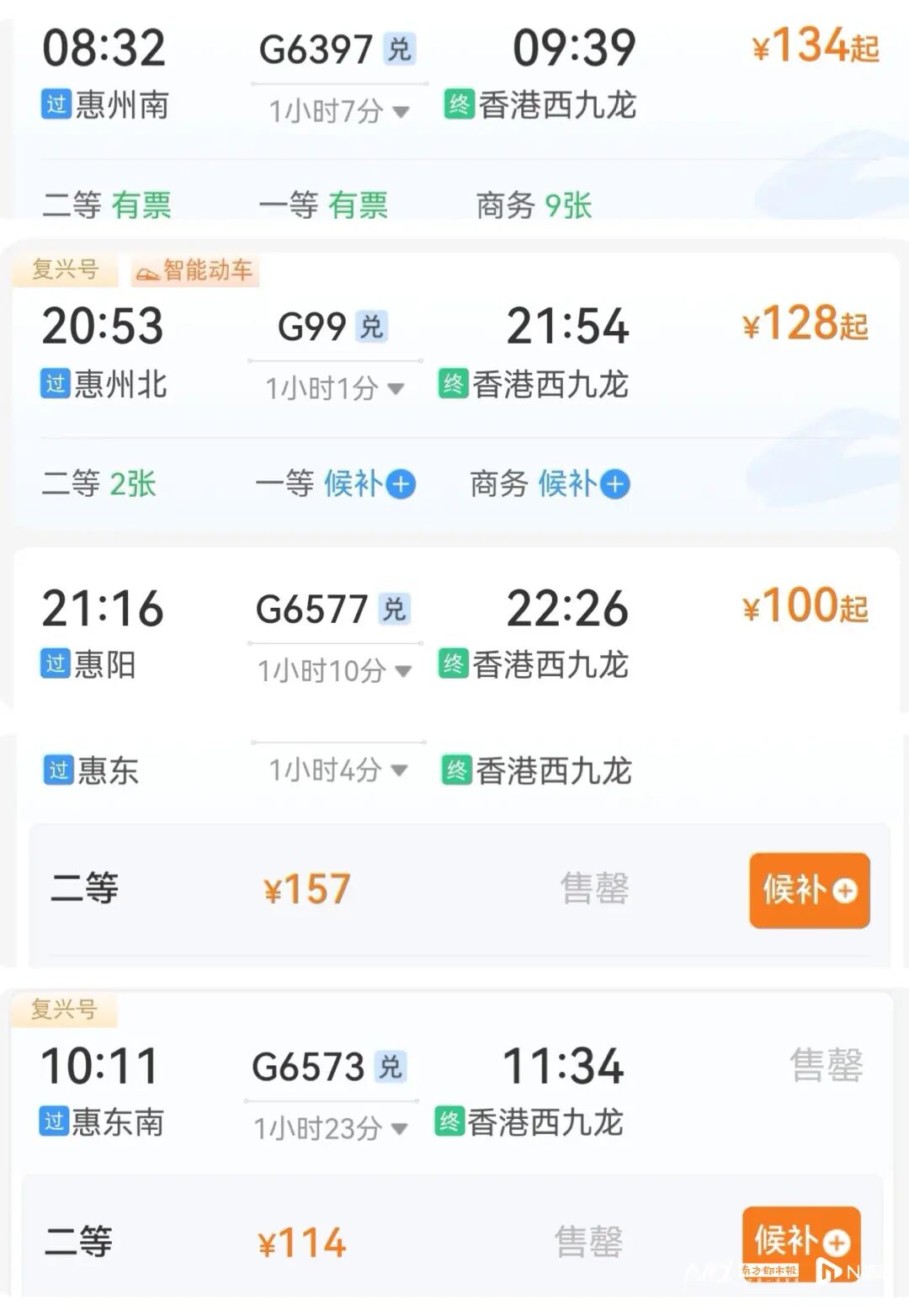 惠州5高鐵站直達(dá)香港西九龍票價(jià)。