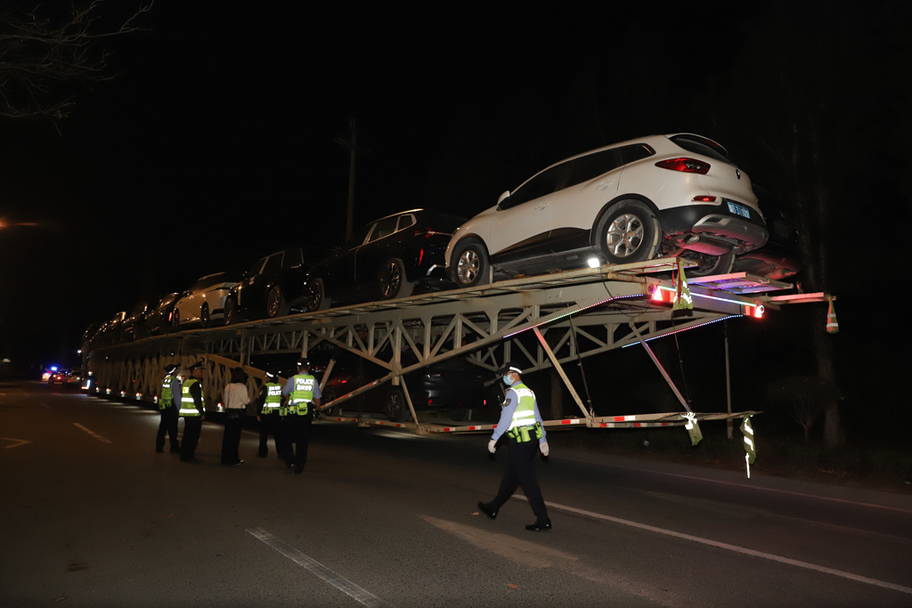 最終,在惠州執(zhí)法部門的強力震懾下,9輛車輛運輸車在石灣收費站前停了下來,?柯愤吔邮軝z查。記者現(xiàn)場發(fā)現(xiàn),這些車輛運輸車多為外省號牌,車身長度大多近50米,每輛車拉載各類車輛20多臺。
