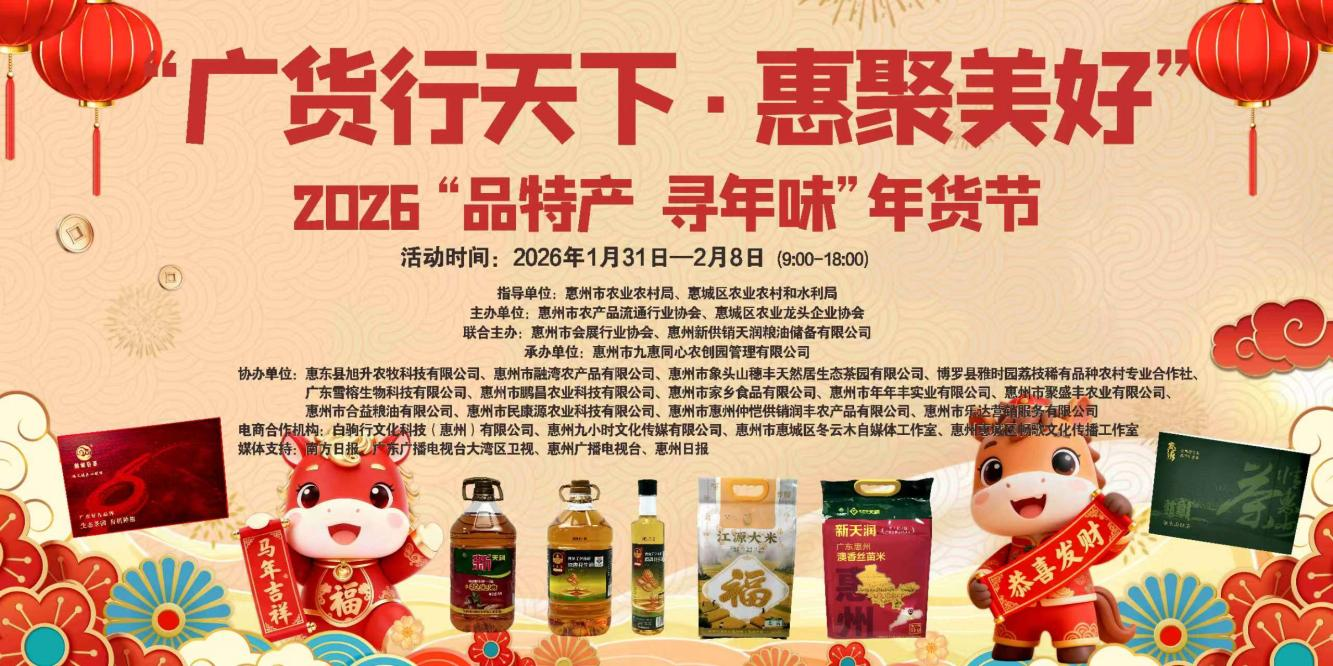 為響應(yīng)農(nóng)業(yè)農(nóng)村部“品特產(chǎn)·尋年味”消費(fèi)促進(jìn)活動(dòng)及廣東省“廣貨行天下”春季行動(dòng)部署,一場(chǎng)兼具煙火氣、文化味與公益性的新春年貨盛宴即將啟幕——惠州市農(nóng)業(yè)農(nóng)村局協(xié)同市商務(wù)局、惠州日?qǐng)?bào)社、各相關(guān)縣區(qū)及行業(yè)協(xié)會(huì),于1月28日至2月15日,推出“廣貨行天下·惠聚美好”新春年貨節(jié)系列活動(dòng),以四站聯(lián)動(dòng)、線(xiàn)上線(xiàn)下融合的方式,集中亮出惠州特色農(nóng)產(chǎn)品“家底”,讓市民游客輕松囤好物、暖迎馬年新春。
