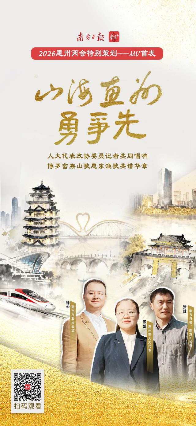 2月4日,在2026年惠州市兩會召開之際,南方日報、南方+客戶端重磅推出惠州打造廣東高質(zhì)量發(fā)展新增長極主題歌曲MV——《山海惠州勇爭先》,由惠州市人大代表陳劍、市政協(xié)委員鐘華與南方日報、南方+記者張峰共同演繹,共唱惠州“十五五”揚帆奮進時代贊歌。