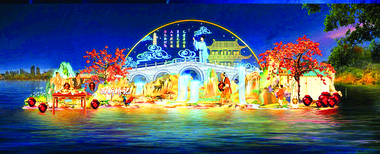 第十六屆惠州西湖新春燈會將于2月14日亮燈,將以“嶺南萬戶皆春色”“西新橋記”“佳人相見一千年”等大型主題燈組再現(xiàn)東坡寓惠的歷史場景。這是主題燈組效果圖。 惠州市西湖景區(qū)管理中心供圖