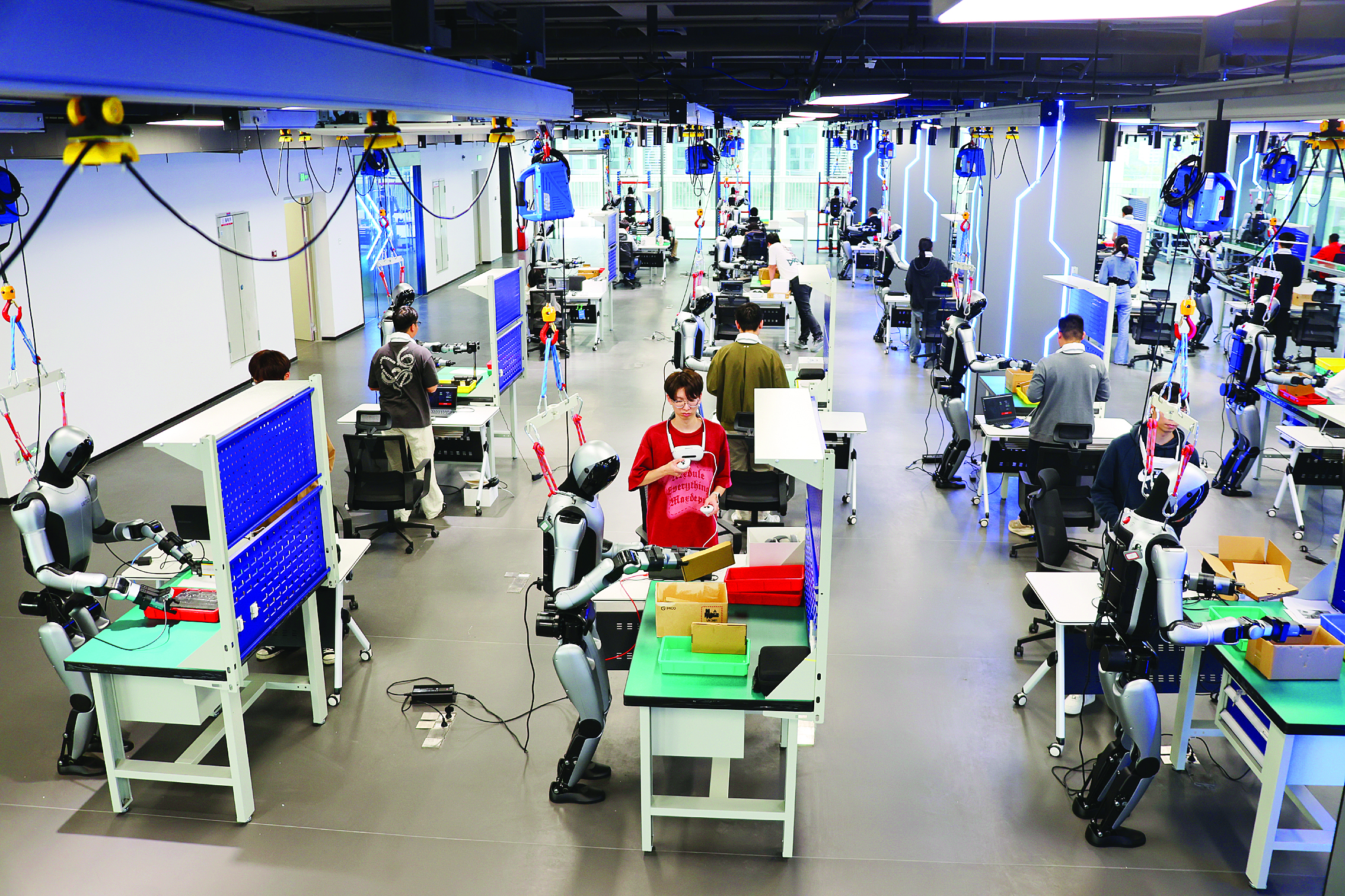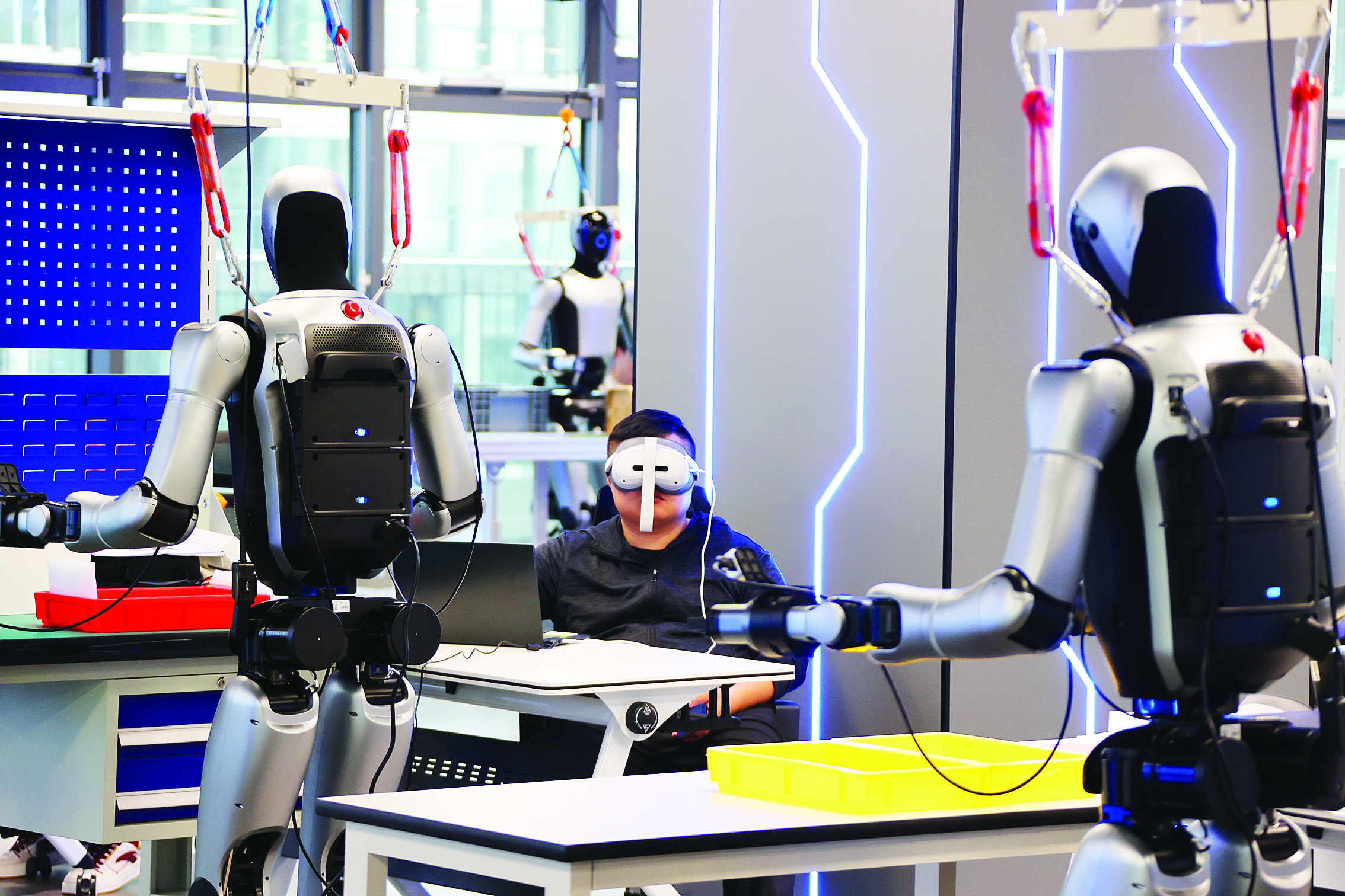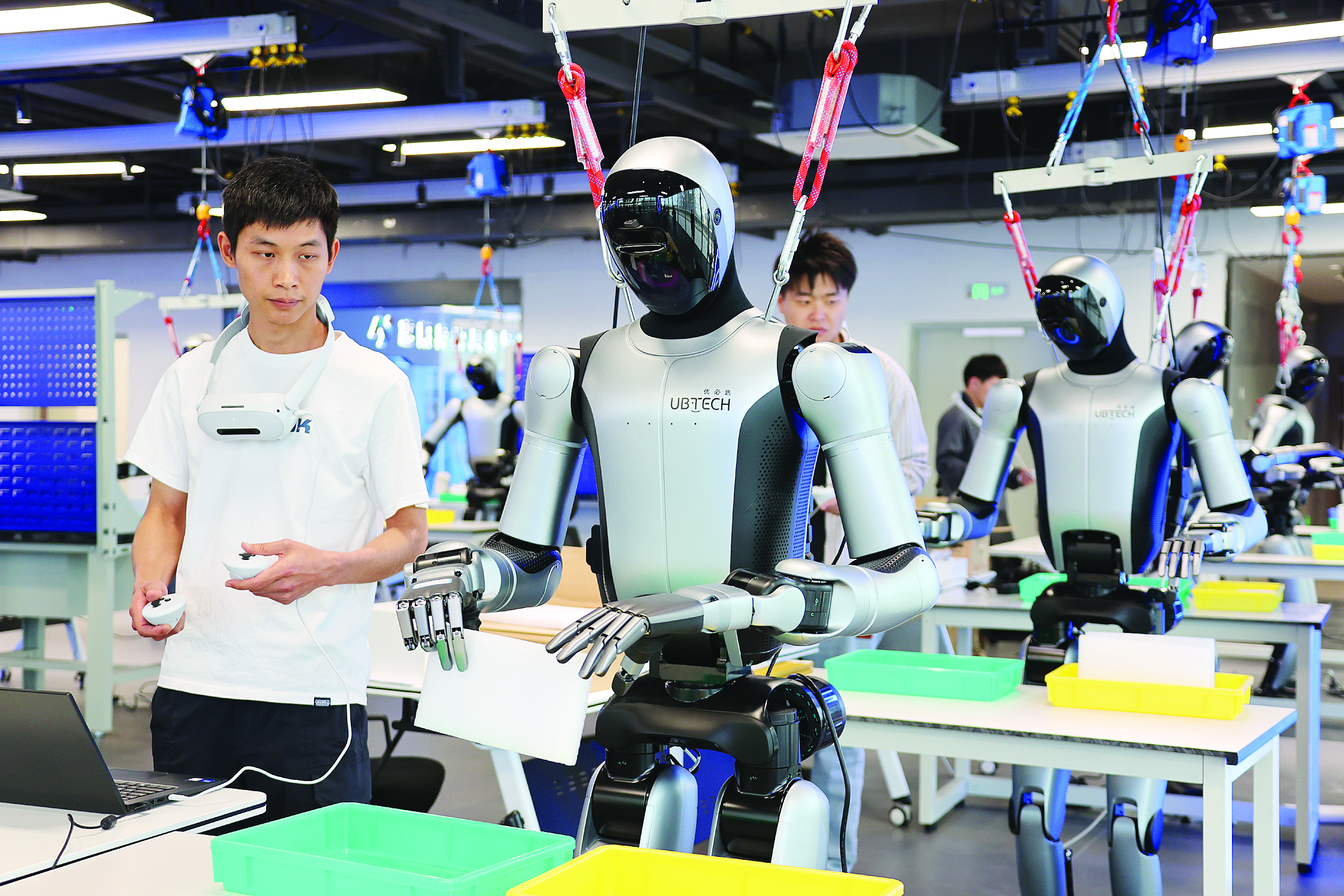 惠州市惠陽區(qū)惠陽異構(gòu)具身智能訓(xùn)練場,機器人數(shù)據(jù)采集員在認真訓(xùn)練人形機器人并采集相關(guān)數(shù)據(jù)。