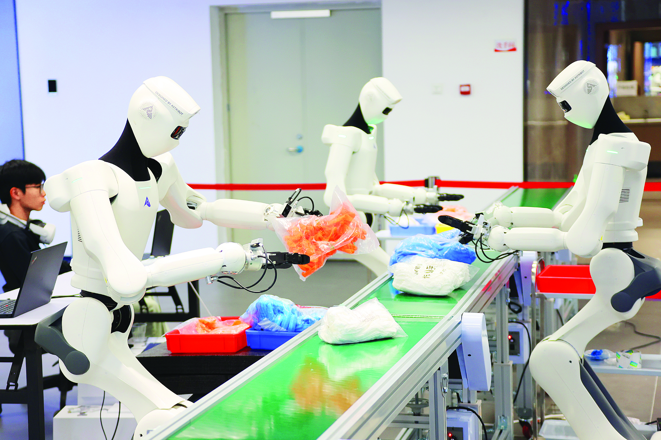 惠州市惠陽區(qū)惠陽異構(gòu)具身智能訓(xùn)練場,機器人數(shù)據(jù)采集員訓(xùn)練人形機器人模擬人類動作快速在傳送帶上分揀物品。