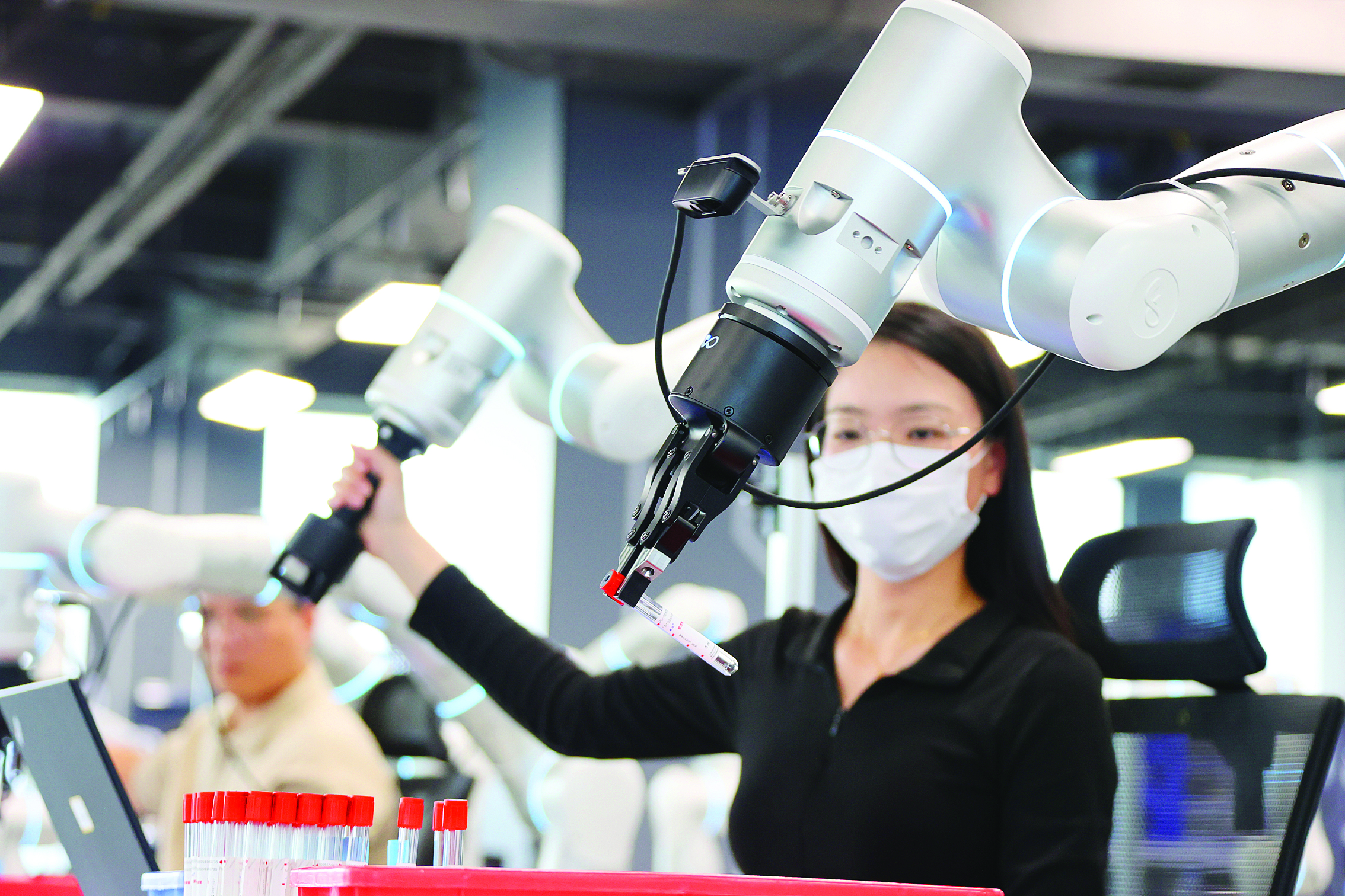 機器人數(shù)據(jù)采集員在訓(xùn)練人形機器人模擬醫(yī)務(wù)工作者做血液檢測試驗,并采集相關(guān)數(shù)據(jù)。未來這些機器人可能成為醫(yī)療行業(yè)特殊崗位工作者。