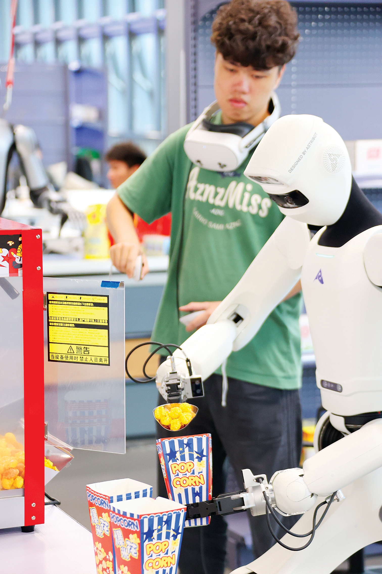 機器人數(shù)據(jù)采集員在訓(xùn)練人形機器人模擬人類動作,售賣爆米花,并采集相關(guān)數(shù)據(jù)。未來這些機器人可能成為景區(qū)和電影院等公共場所的爆米花售賣員。