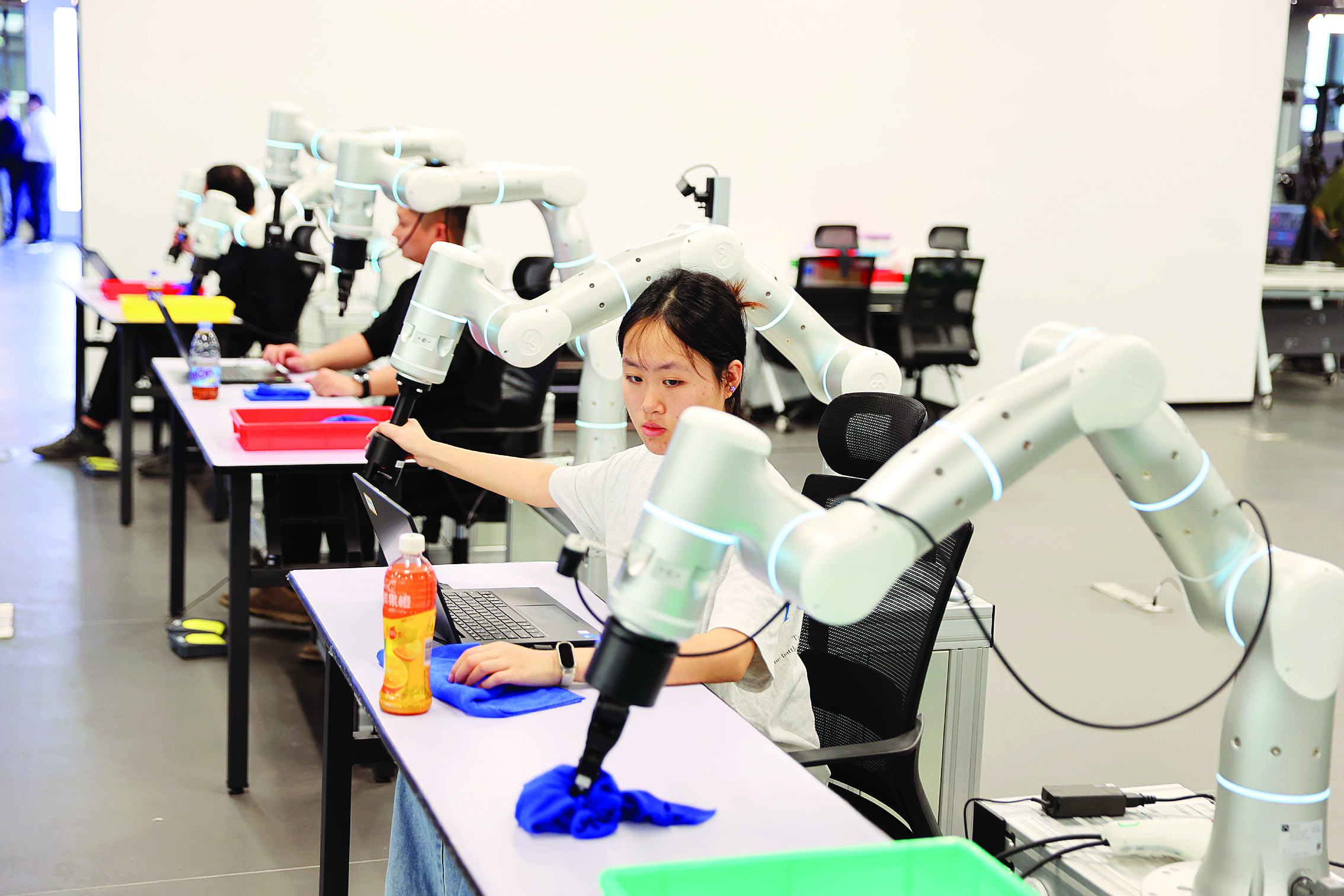 走進訓(xùn)練場,仿佛踏入了科幻電影的實景片場:人形機器人化身“收銀員”,在服務(wù)臺一只手分揀商品一只手拿著設(shè)備“掃碼”;服務(wù)機器人變身“客房管家”,在模擬房間里整理被褥;物流機器人成了“分揀能手”,將快遞包裹投放到指定位置……各類機器人各司其職、刻苦“練兵”,盡顯科技魅力。