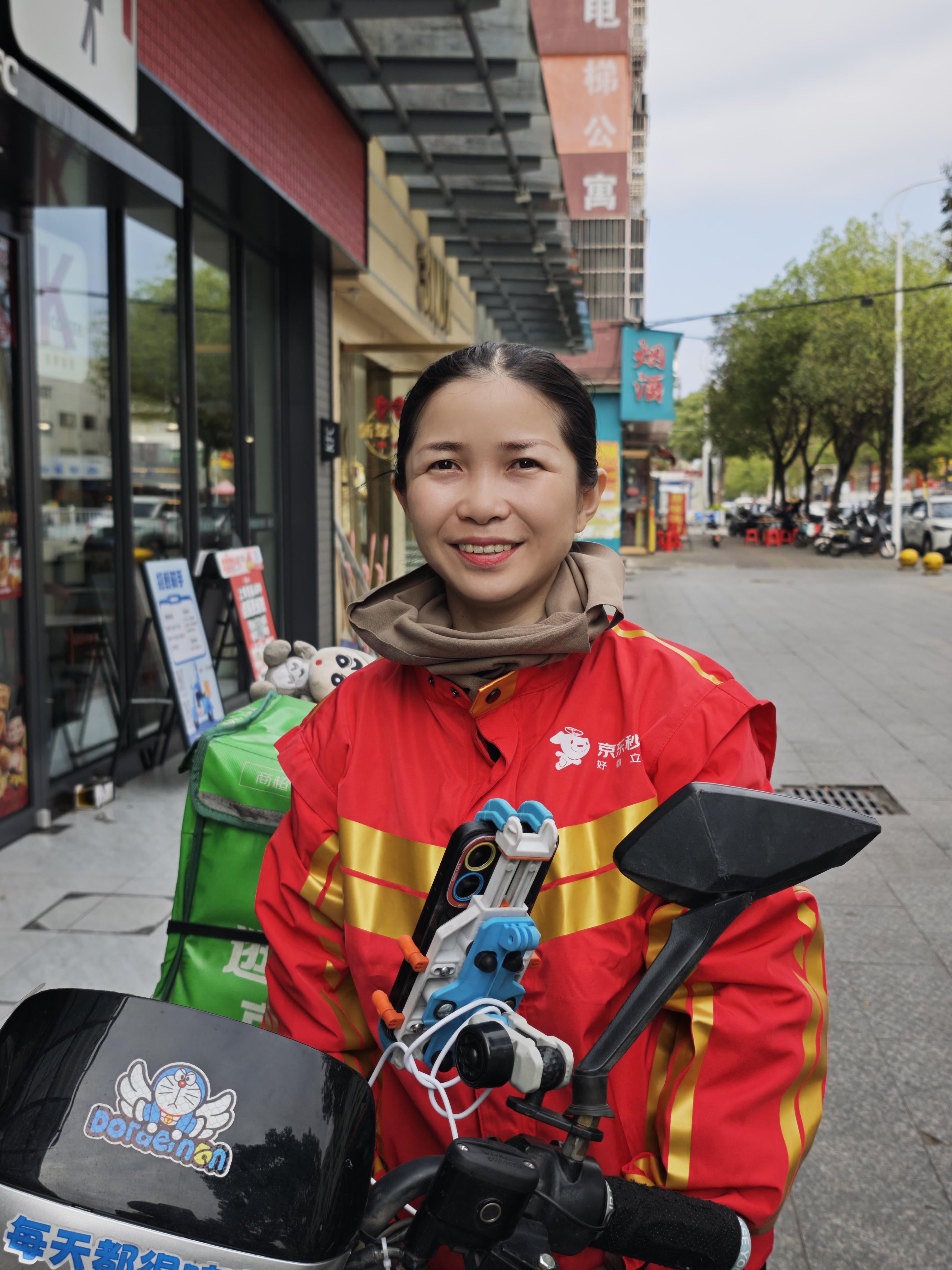 “85”后的鄧雅婷是惠州本地人,之前是工廠計(jì)劃員,月薪七八千元。丈夫在外地工作,老人幫忙帶孩子,休息日閑不住的她便試著跑外賣。2024年7月,她開始做眾包騎手,從一天幾單到一天十幾單,漸漸喜歡上這種“送到就完事”的純粹感。2025年1月,企業(yè)倒閉,失業(yè)的她干脆把兼職做成了全職,加入京東秒送,成了惠城區(qū)烏石片區(qū)的駐店配送員。