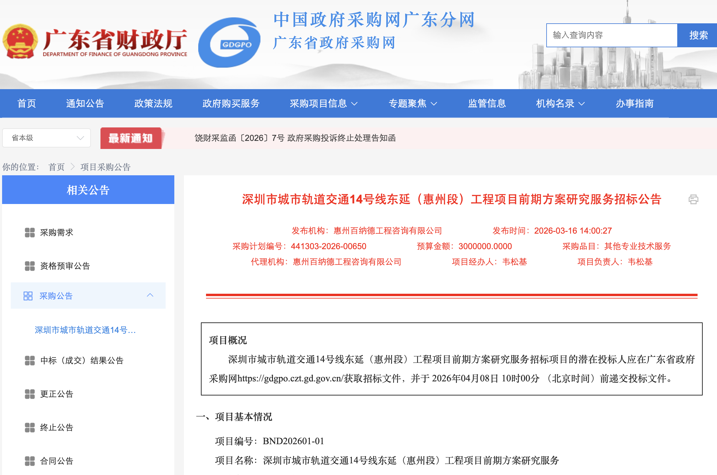 根據(jù)廣東省政府采購(gòu)網(wǎng)發(fā)布的《深圳市城市軌道交通14號(hào)線東延(惠州段)工程項(xiàng)目前期方案研究服務(wù)招標(biāo)公告》,該項(xiàng)目的采購(gòu)方式為公開招標(biāo),采購(gòu)包預(yù)算金額為300萬(wàn)元,投標(biāo)人應(yīng)在廣東省政府采購(gòu)網(wǎng)獲取招標(biāo)文件,并于2026年4月8日10時(shí)前遞交投標(biāo)文件。該項(xiàng)目采購(gòu)人信息為惠州市惠陽(yáng)區(qū)交通運(yùn)輸局。