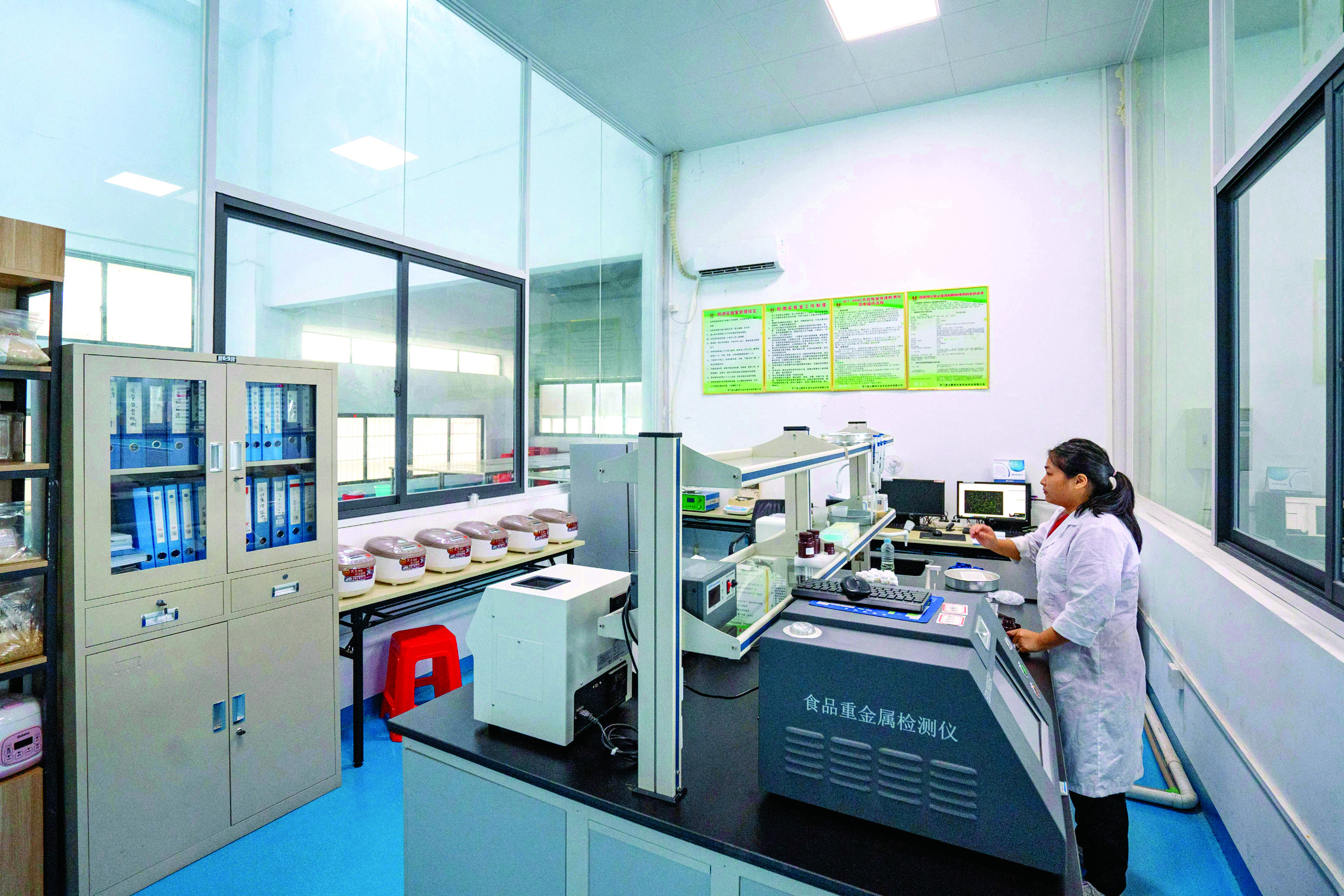 龍門縣絲苗米省級現(xiàn)代農(nóng)業(yè)產(chǎn)業(yè)園內(nèi)工作人員對大米進行檢測;葜輺|江圖片社提供