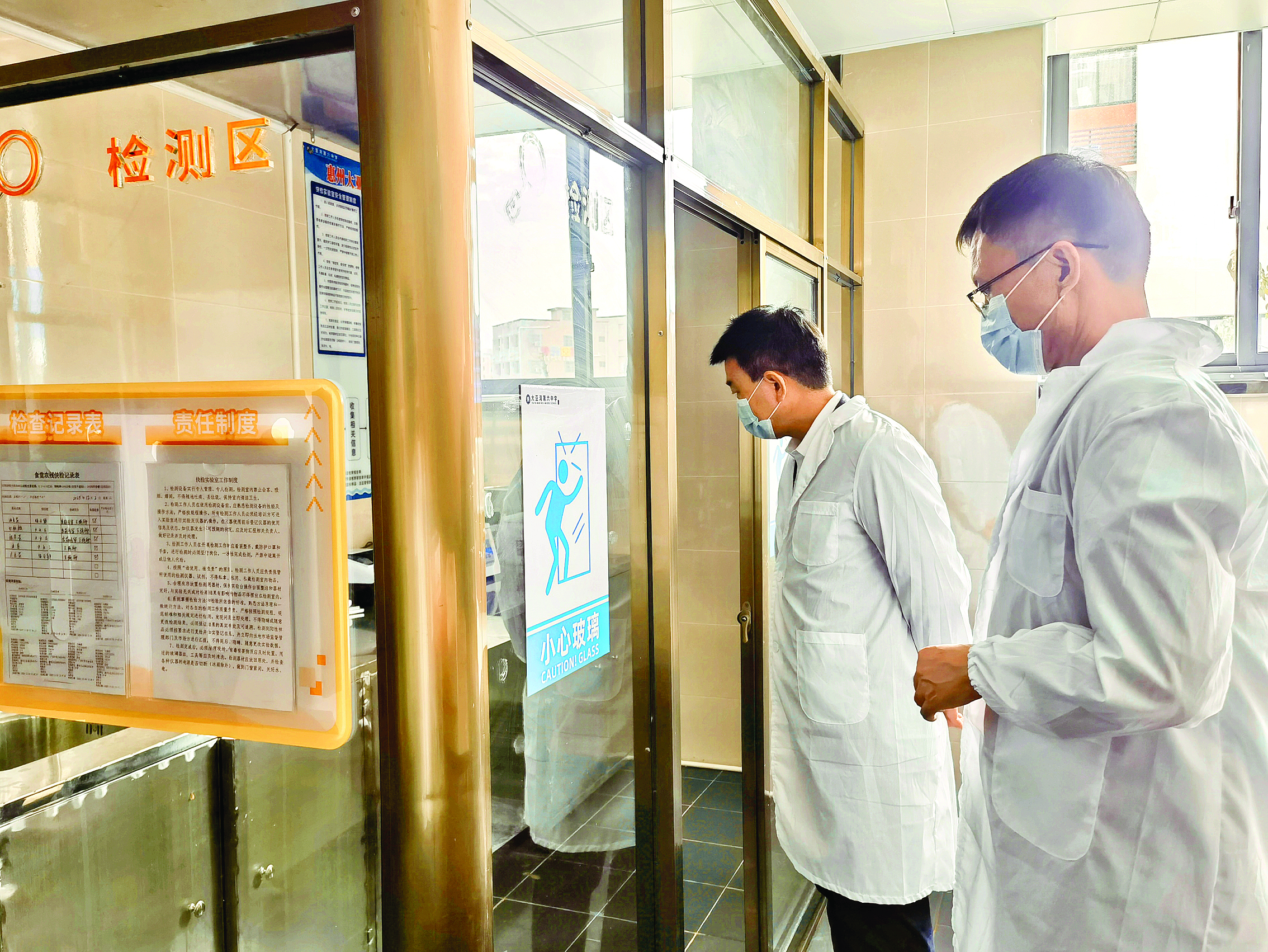 檢查組到大亞灣第六中學監(jiān)督食材快速檢測開展情況。