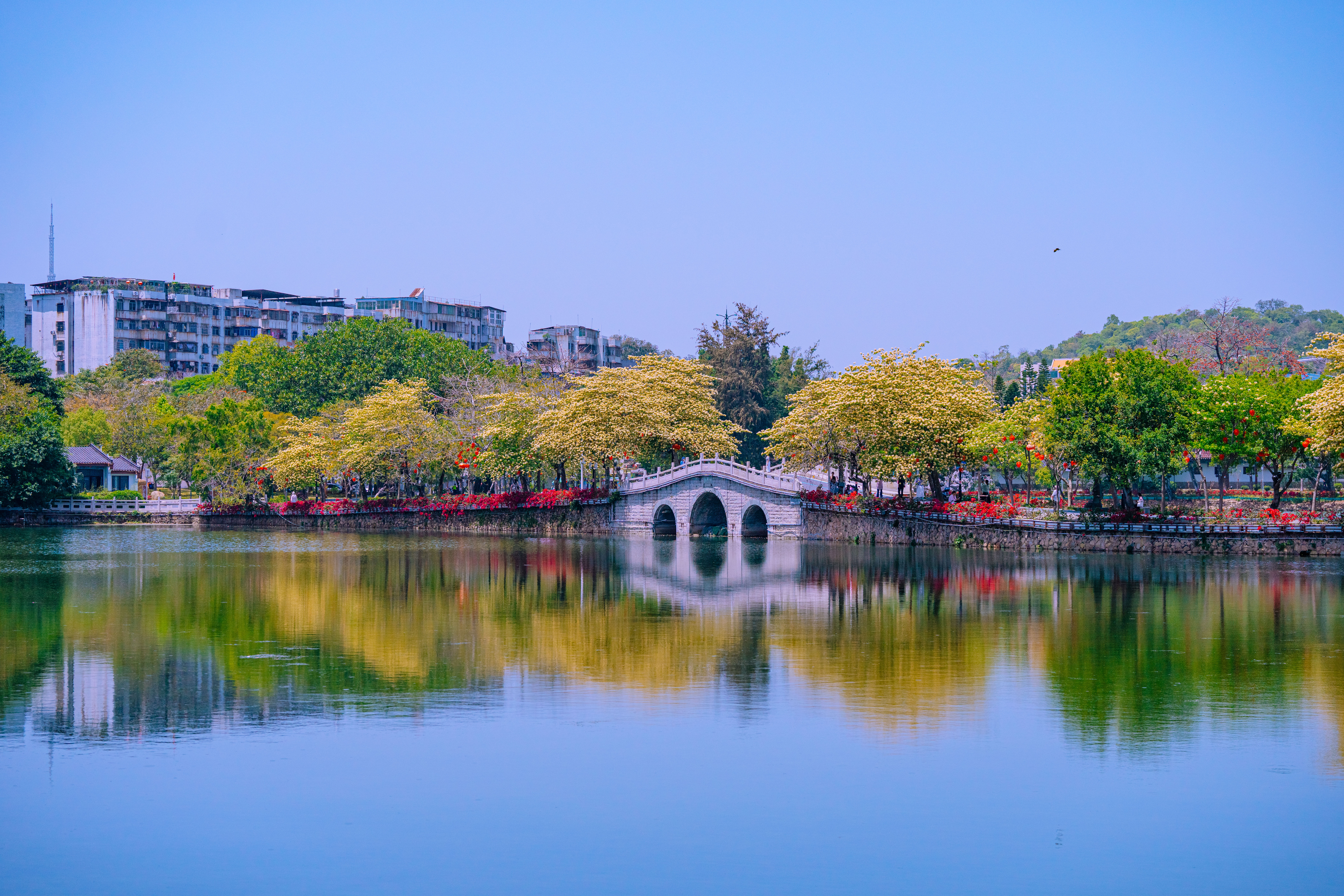 春日時(shí)節(jié),惠州西湖沿岸的魚木花迎來(lái)盛放期。金黃璀璨的花簇綴滿枝頭,與澄澈湖水、古橋倒影相映成趣,構(gòu)成一幅絕美的春日畫卷。盛放的魚木花為西湖增添了浪漫氛圍,成為市民游客春日踏青、打卡賞景的熱門景致,盡顯惠州西湖的生態(tài)之美與城市生機(jī)。