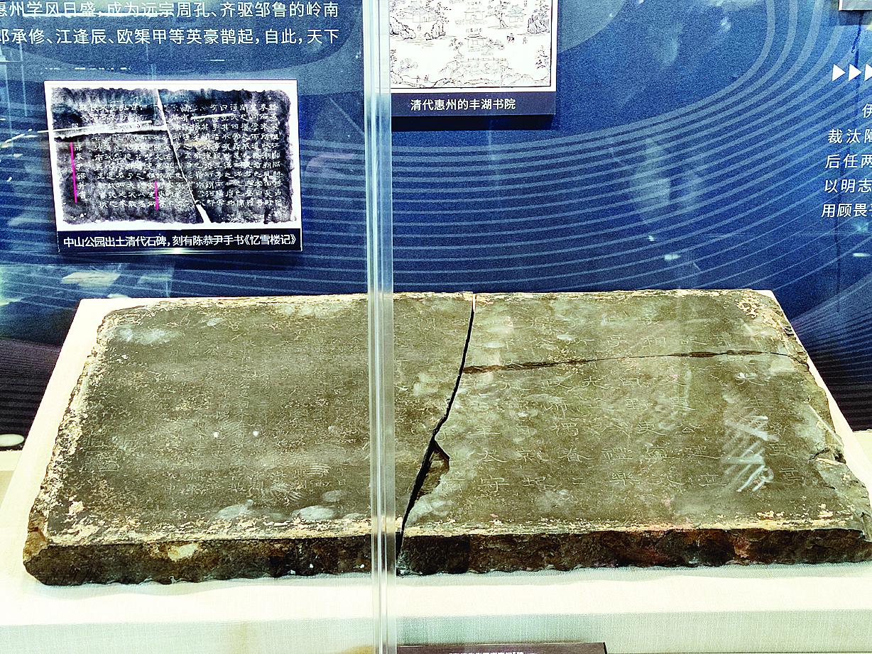 惠州千年府衙,掀開歷史一角,隋代梌井、隋唐瓦當(dāng)、宋代東平窯陶瓷、明代白馬窯瓷器以及“府城磚”“歸善”等銘文城磚都一一出土,展示惠州悠久歷史和文化積淀。記者留意到,此次出土文物中,有一塊刻于清乾隆五十三年(1788)的“東坡先生野吏亭記”碑,碑刻背面為清康熙二十九年(1690)陳恭尹為惠州知府王煐撰并書的《憶雪樓記》(殘),一碑兩記為梌山增添歷史見證物。