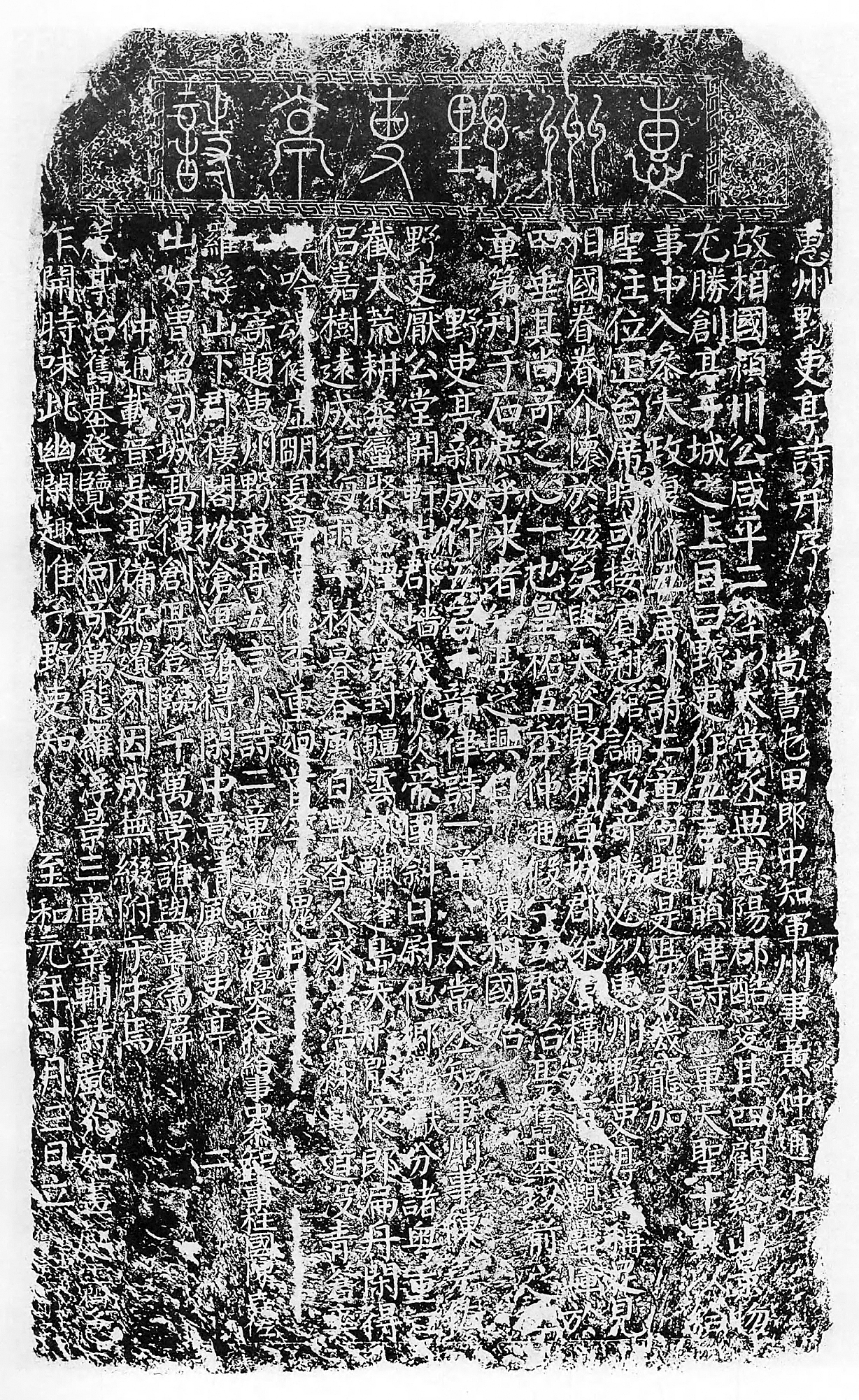 宋至和元年(1054),惠州太守黃仲通修葺野吏亭,將陳堯佐所賦五言詩三首并他所作之序、五言詩一首勒石,為“惠州野吏亭詩”碑,亦稱“黃碑”。