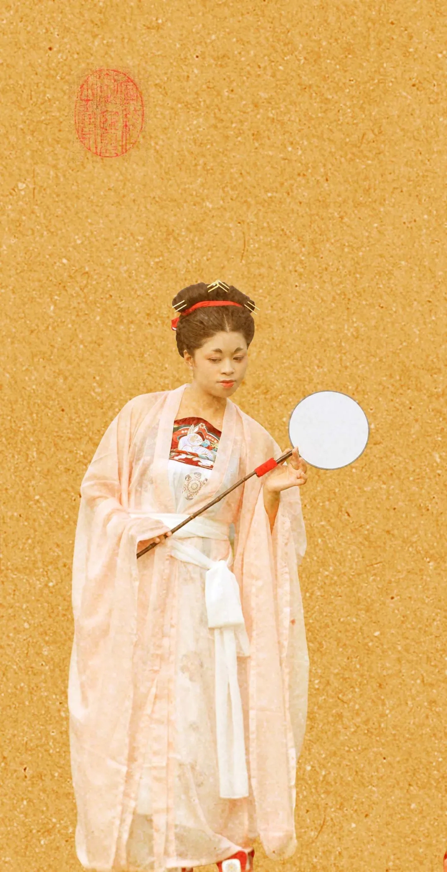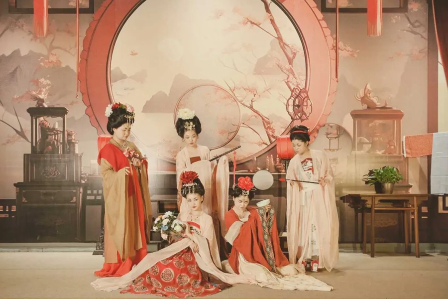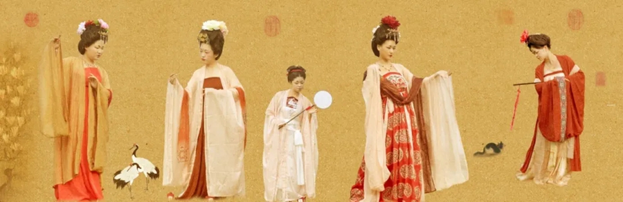 她們妝容精致,眉如遠(yuǎn)山含翠,唇似點(diǎn)朱砂,再現(xiàn)了唐代女性的妝容特點(diǎn);她們舉止優(yōu)雅,步態(tài)輕盈,仿佛從畫中走來(lái),在畫中鏡中如遇畫中人。