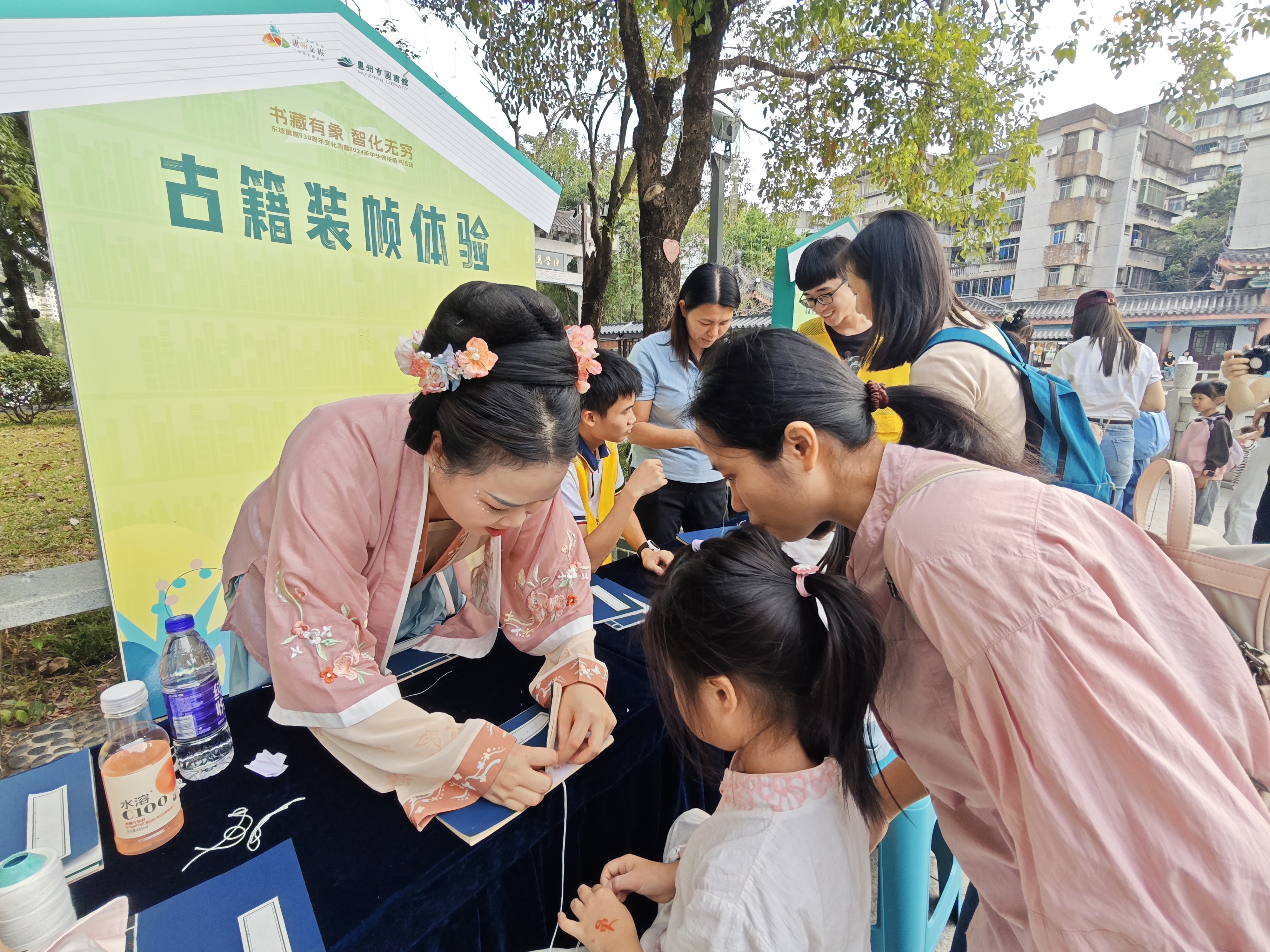 修身閣里,游客專心致志地聽館員講解東坡寓惠詩詞作品,并在誦讀中共同品味詩詞的韻律和情感;菹頃?jī)?nèi),參與者通過對(duì)東坡字帖的現(xiàn)場(chǎng)臨摹,感受東坡書法和詩詞作品的文化魅力。古籍修復(fù)體驗(yàn)區(qū)內(nèi),館員耐心地為市民游客講解并演示修復(fù)的原理、步驟、手法等基礎(chǔ)知識(shí),然后讓游客親手體驗(yàn)破損書頁的修復(fù)。線裝書裝幀區(qū)域里,游客在館員的指導(dǎo)下量線、穿針、拉線,還可以將一本自己親自裝幀的線裝書帶回家。