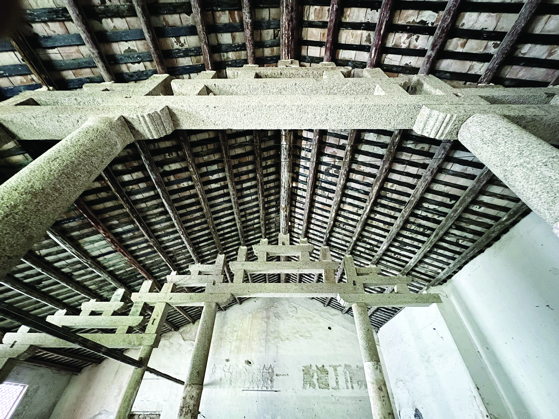 龍泉寺始建于明成化年間(1465~1487),其建筑形制堪稱嶺南佛寺的活化石。寺廟占地2600平方米,原為三進(jìn)院落布局,坐東北朝西南,依山勢而建,形成層層遞進(jìn)的壯觀景象,F(xiàn)存的后殿,采用磚瓦單層結(jié)構(gòu),硬山屋頂,臺梁式與穿斗式混合花崗巖條石架構(gòu)。尤為珍貴的是覆盆式柱礎(chǔ)——這種盛行于唐宋的構(gòu)件在明代已屬罕見,記錄著中原建筑技藝南傳的歷史軌跡。站在殿內(nèi)仰望,但見石木梁枋交錯如棋盤,不用一釘而百年穩(wěn)固,正是《營造法式》中的生動體現(xiàn)。