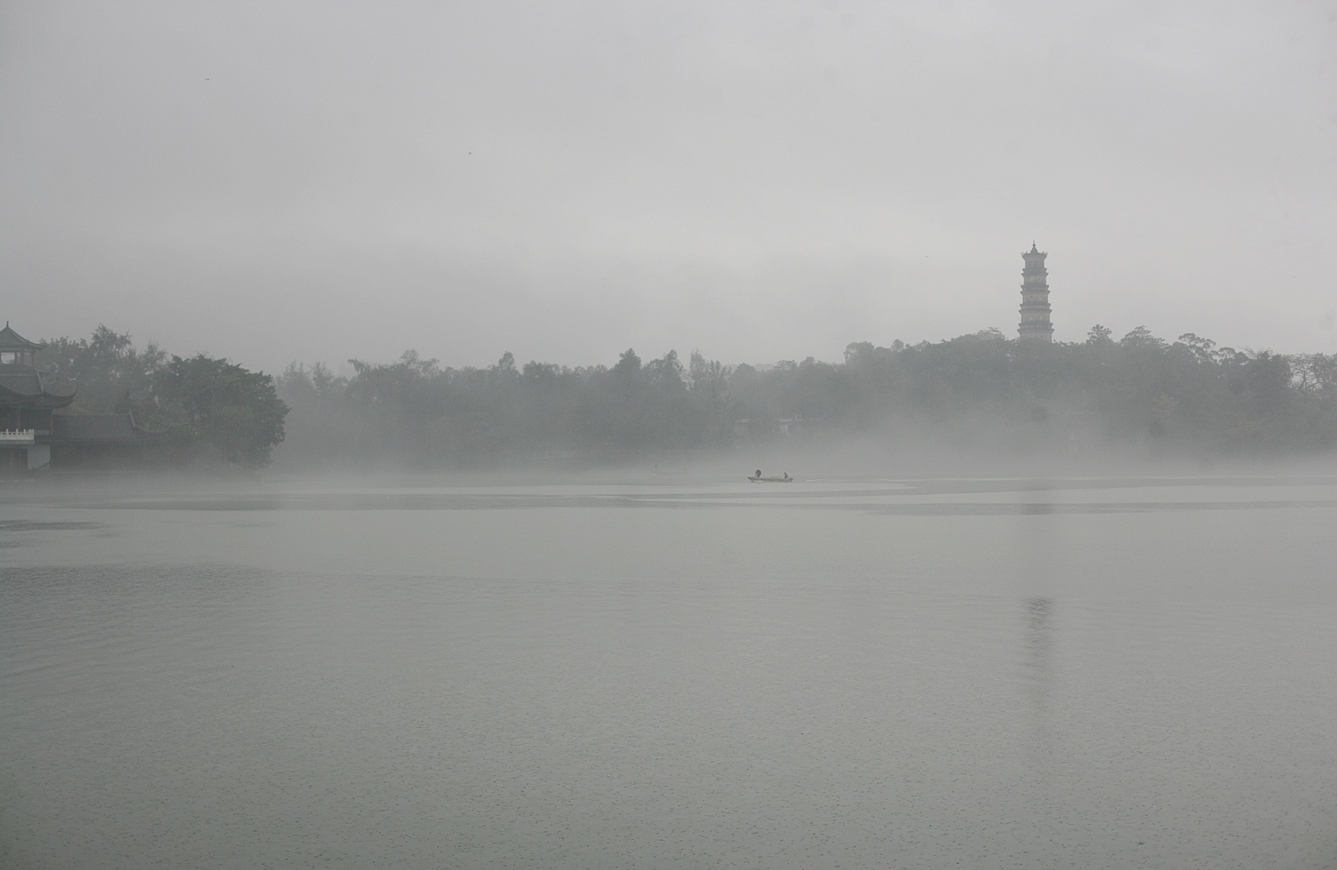 岸邊的柳樹被雨洗得發(fā)亮,柳條垂在水面,隨波輕輕晃動(dòng),像在與湖水說(shuō)著悄悄話。幾個(gè)撐著油紙傘的游人沿著岸邊慢走,身影在雨霧中若隱若現(xiàn),倒成了畫里最生動(dòng)的筆觸。忽然想起蘇軾寓居惠州時(shí)寫下的“日啖荔枝三百顆,不辭長(zhǎng)作嶺南人”,當(dāng)年他或許也在這樣的雨天里漫步西湖,看雨打浮萍,聽浪拍堤岸,把人生的困頓融進(jìn)這湖水里,反倒沉淀出一份通透與豁達(dá)。