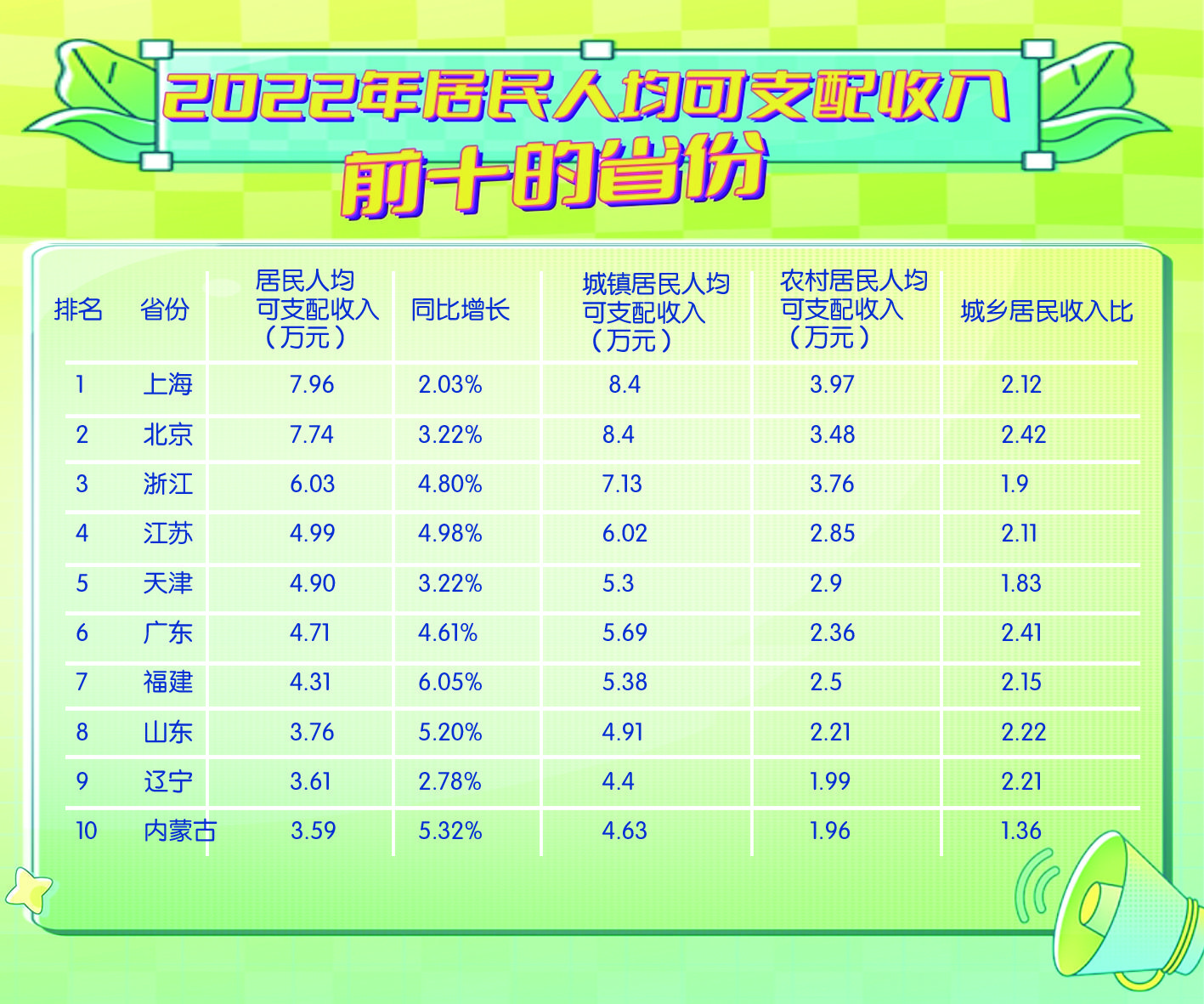 與2021年相比,上海、北京、浙江的居民人均可支配收入仍穩(wěn)居前三,分別為79610元、77415元和60302元,同比增長了2.03%、3.22%和4.8%。