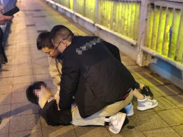 就在此時,那名招手者拉掉了對方的外套,對方趁機(jī)掙脫,爬向橋邊的護(hù)欄。情況危急,還沒等車開到跟前時,特警們便立即下車奔跑過去,迅速從機(jī)動車道翻越與人行道間隔的欄桿,和那名招手者一同拉住了輕生男子。
