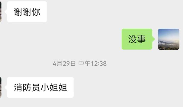 后來(lái),小伙給周穎發(fā)了一條微信說(shuō),謝謝消防員姐姐。