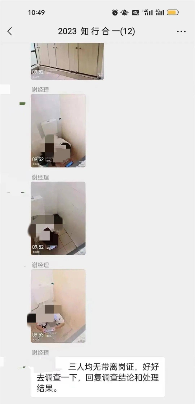 網(wǎng)友發(fā)布的群聊截圖顯示,在一個(gè)名為“2023知行合一”的聊天群內(nèi),群聊昵稱為“謝經(jīng)理”的一名人員,發(fā)了一張某廁所內(nèi)的環(huán)境圖,以及三張相關(guān)人員的如廁私密照!爸x經(jīng)理”還@了群內(nèi)另一名人員稱:“三人均無(未)帶離崗證,好好去調(diào)查一下,回復(fù)調(diào)查結(jié)論和處理結(jié)果!