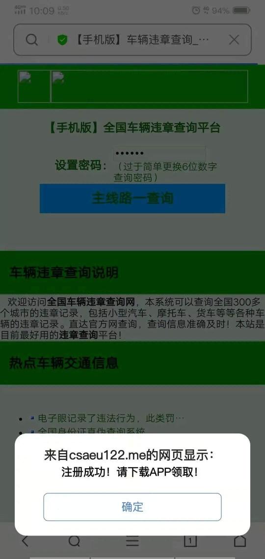 點擊鏈接后,彈出的是“山寨版”交通違法查詢平臺,如果按要求輸入姓名、身份證信息、手機(jī)號、設(shè)置密碼,就會泄露很多個人信息。騙子要的不止這些,下一步是引導(dǎo)受害人下載詐騙App,達(dá)到騙錢的目的。