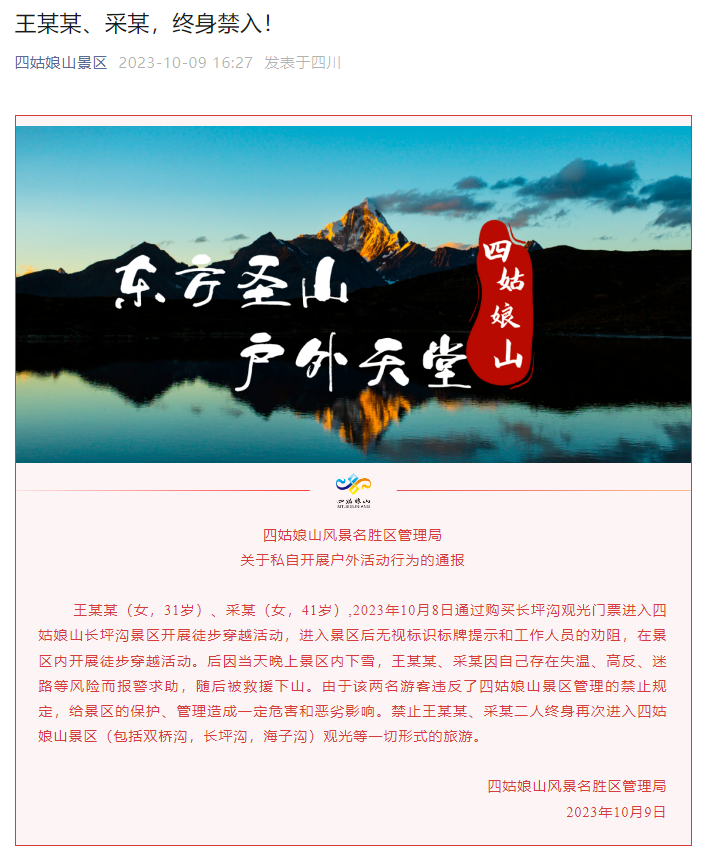 王某某(女,31歲)、采某(女,41歲),2023年10月8日通過購買長坪溝觀光門票進入四姑娘山長坪溝景區(qū)開展徒步穿越活動,進入景區(qū)后無視標(biāo)識標(biāo)牌提示和工作人員的勸阻,在景區(qū)內(nèi)開展徒步穿越活動。后因當(dāng)天晚上景區(qū)內(nèi)下雪,王某某、采某因自己存在失溫、高反、迷路等風(fēng)險而報警求助,隨后被救援下山。由于該兩名游客違反了四姑娘山景區(qū)管理的禁止規(guī)定,給景區(qū)的保護、管理造成一定危害和惡劣影響。禁止王某某、采某二人終身再次進入四姑娘山景區(qū)(包括雙橋溝,長坪溝,海子溝)觀光等一切形式的旅游。