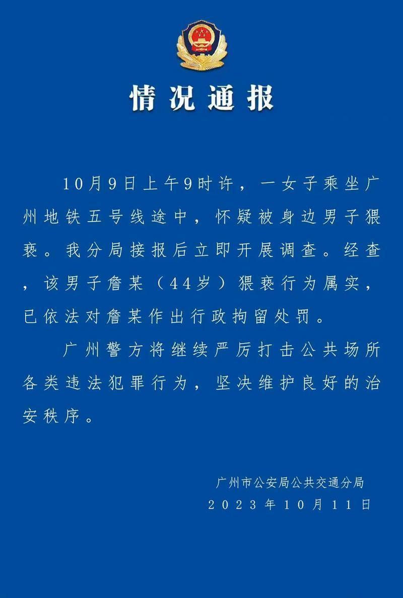 廣州公交警方10月11日下午通報(bào),10月9日上午9時(shí)許,一女子乘坐廣州地鐵五號(hào)線途中,懷疑被身邊男子猥褻。我分局接報(bào)后立即開展調(diào)查。經(jīng)查,該男子詹某(44歲)猥褻行為屬實(shí),已依法對(duì)詹某作出行政拘留處罰。廣州警方將繼續(xù)嚴(yán)厲打擊公共場所各類違法犯罪行為,堅(jiān)決維護(hù)良好的治安秩序。